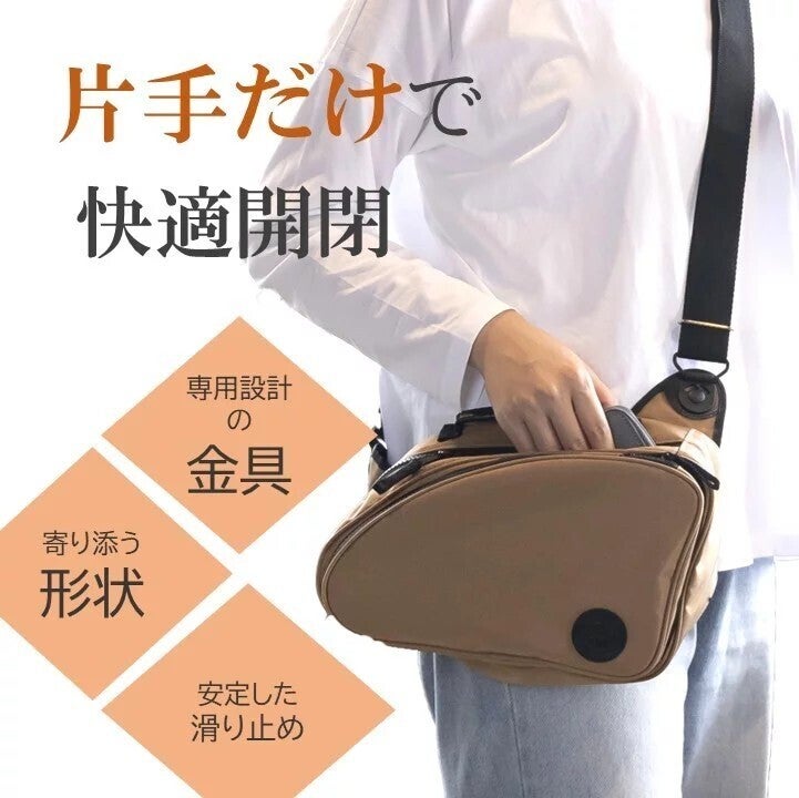 自立することにより、座った状態でも膝の上で安定してモノの出し入れをすることが出来ます。持ち手があることにより、片手で簡単に持ち運べ、引き寄せるなどバッグの取り回しを快適に行えます。