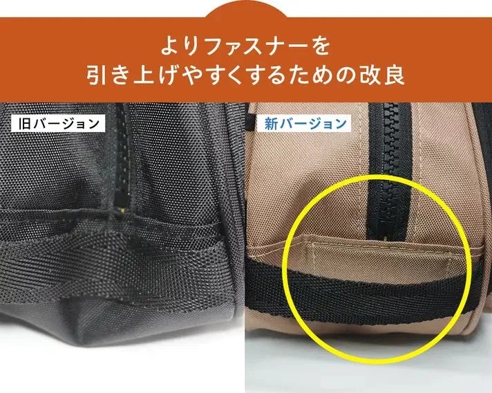 旧バージョンでは、ファスナー引き上げ時、生地が折れ込んでしまい、ファスナーが引っかかってしまう事がありますが、新バージョンはファスナー引き上げを安定して行えるよう固定板を追加しました。