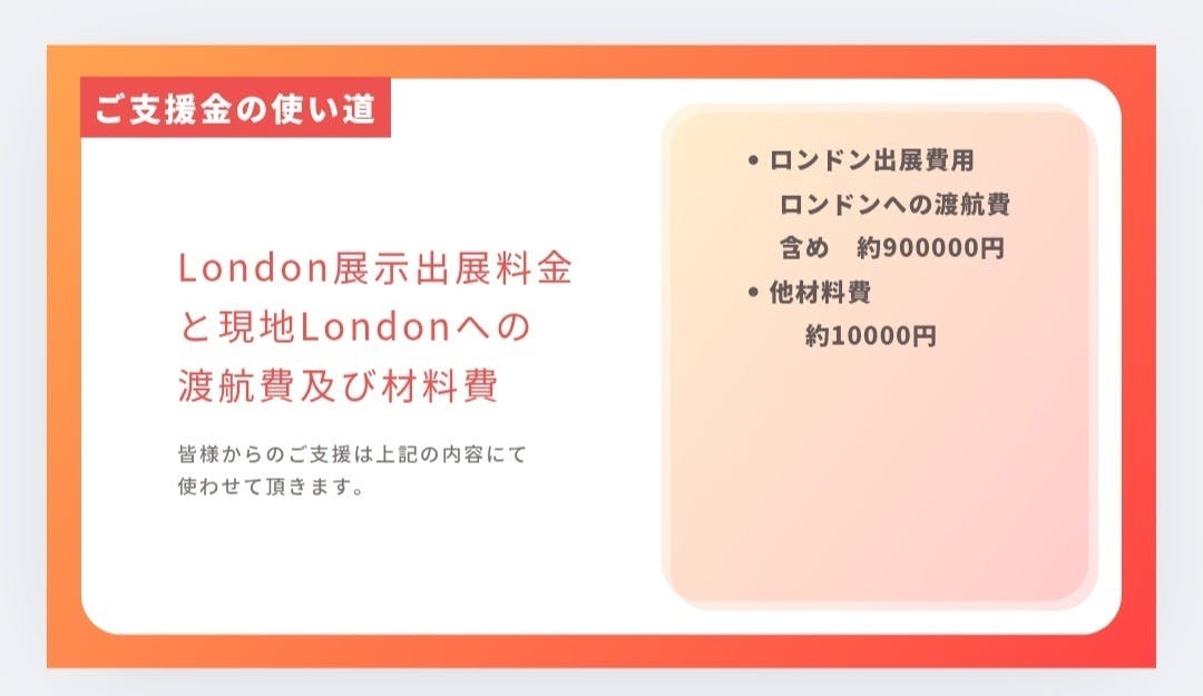 このプロジェクトでは、2026年4月にロンドンでのアート展示に参加するための出展料金と、現地で私のアートを鑑賞するための渡米資金を集めることを目指しています。ロンドンの展示会は、私の作品を国際的な観客に披露する絶好の機会であり、私のキャリアにおいて重要なステップとなると思っています。