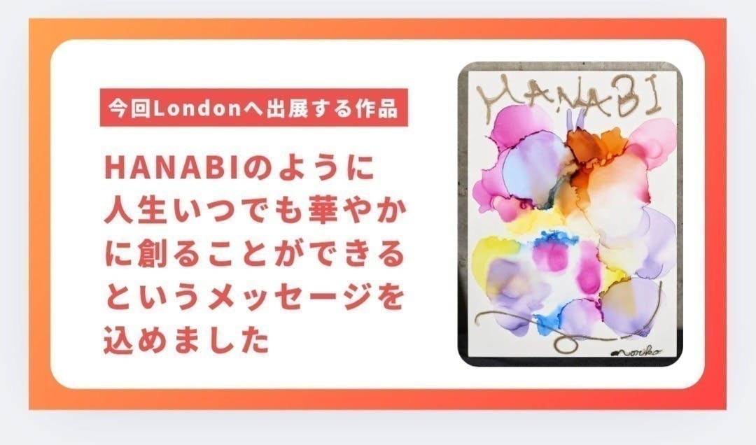 PARIでの展示をきっかけに多くの方々からアートのご感想をいただき、私の想いがアートを通じて着々と日本から飛び出し世界へ伝わっているんだなあと実感出来ました。PARIへ出展した作品【HANABI】で再びロンドンへ出展したいと思っております。今回のロンドンでの展示は、私がこれまで培ってきた技術と情熱を世界に発信する大きな舞台となります。そして現地ロンドンで自分のアートを見届けたいという想いが強くあり、ロンドンへの渡米へかかる渡航資金と展示に向けての出展料金を是非ともクラウドファンディングを通して皆様にご協力をお願いしています。皆様のご支援があれば、この夢を現実可能になります。