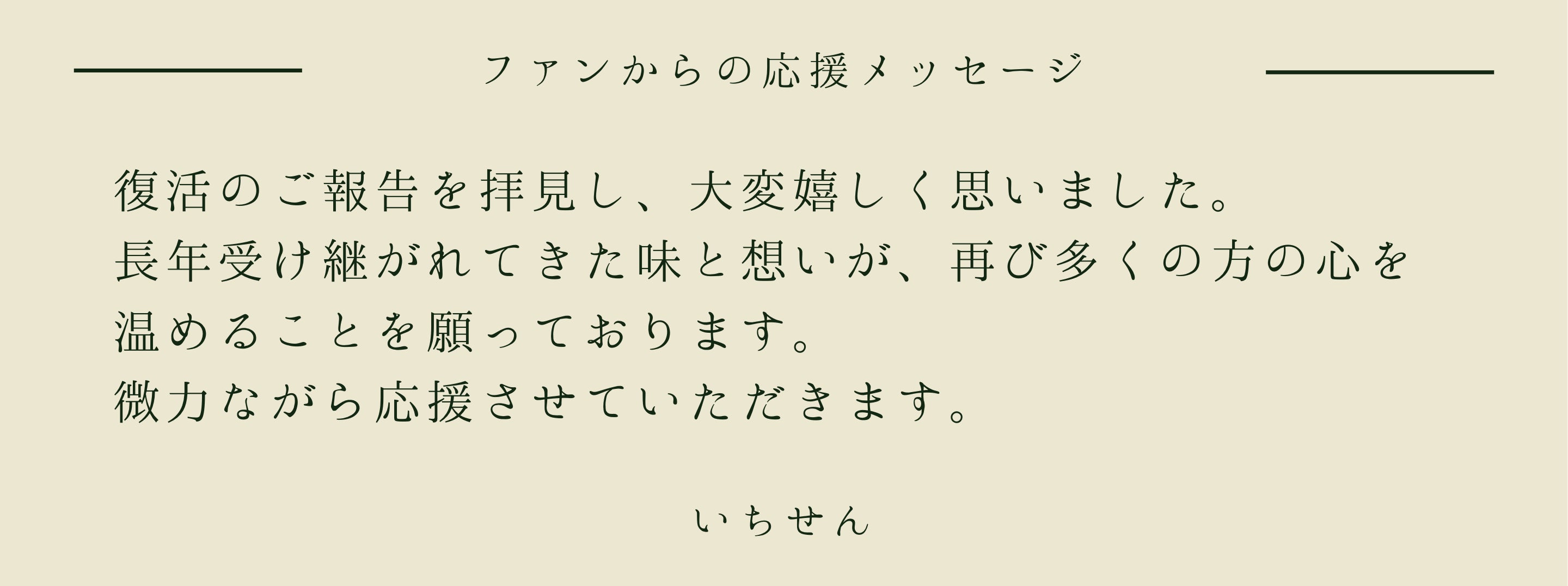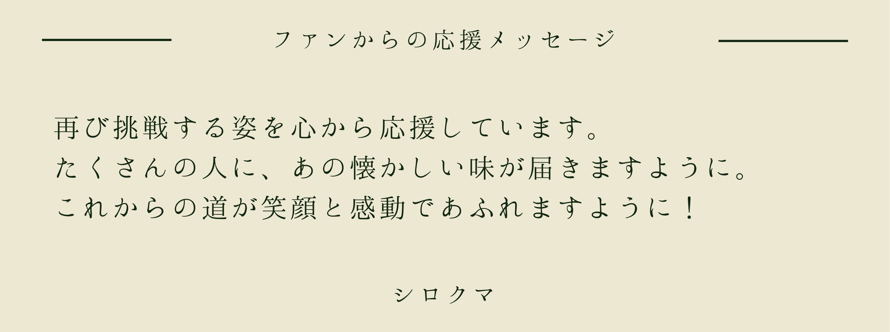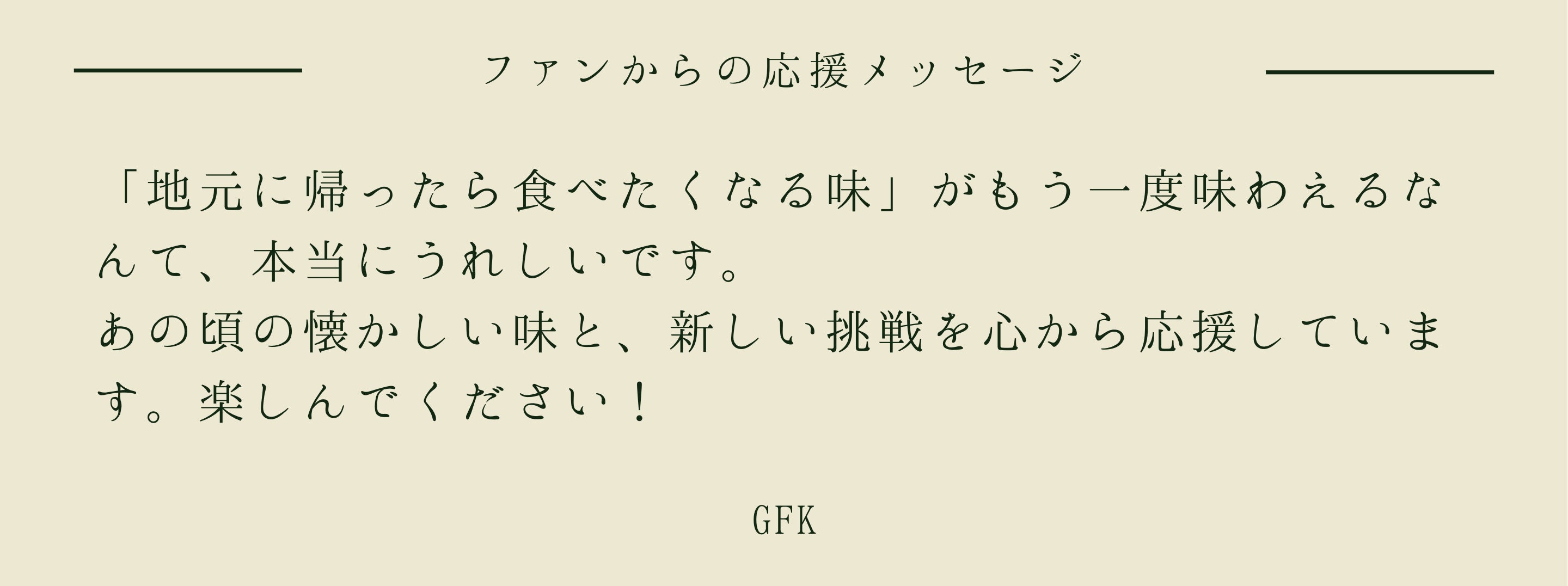 この声は本当に嬉しいことで、あの味を復活をさせたいと思っていた私たちの背中を押してくれました!