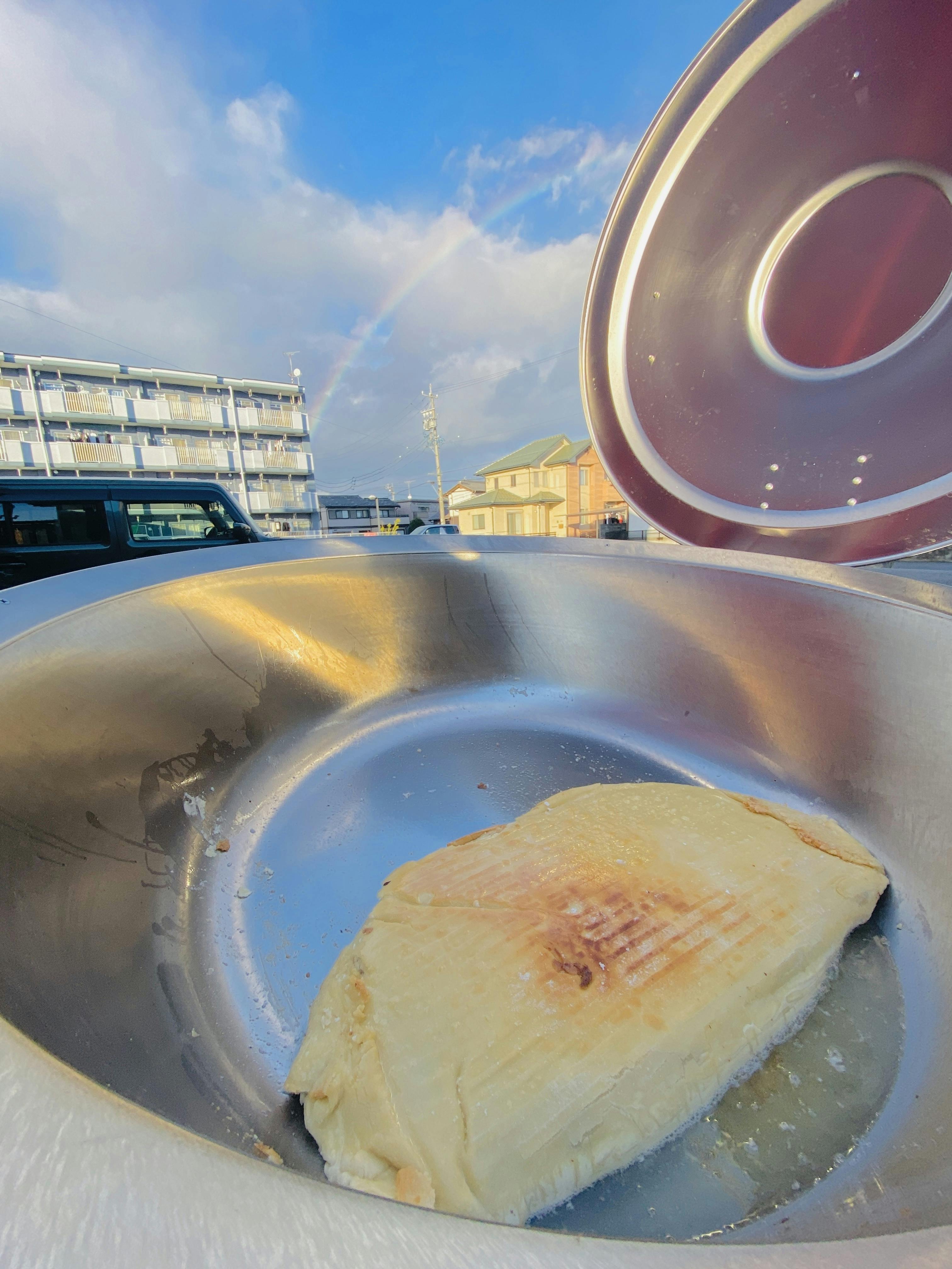 試作を繰り返し、成功と失敗の連続ですが日々の積み重ねをデータ化して、本番に向けて頑張ります!屋外で試作中に奇跡が起きました!虹と餃子のコラボ