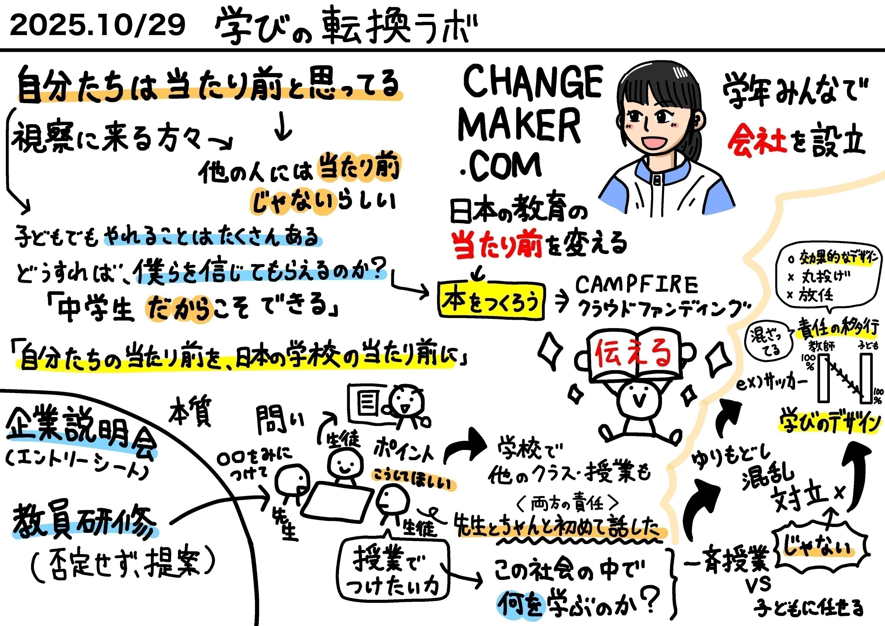 2025/12/19 20:25【塚本さんによるグラレコ講座】サポーターである塚本さんの月一回本校視察!今回は、グラレコ講座を実施してもらいました。(ソニーなどでも塚本さんは実施しています)これから必要な、情報を効率的にまとめる、表現するスキルの獲得に一歩前進です。このスキルは、本作りにもかなり有効です。昼休みには、CHANGEMAKER.COMの役員会に参加してもらいまい、たくさんの視点や意見交換を行いました。余談ですが、昨日は神奈川県逗子市から授業視察がありました。視察から、僕たちのファンを増やしていくことも大切だと感じました。いつでも、誰でも大歓迎です。 もっと見る