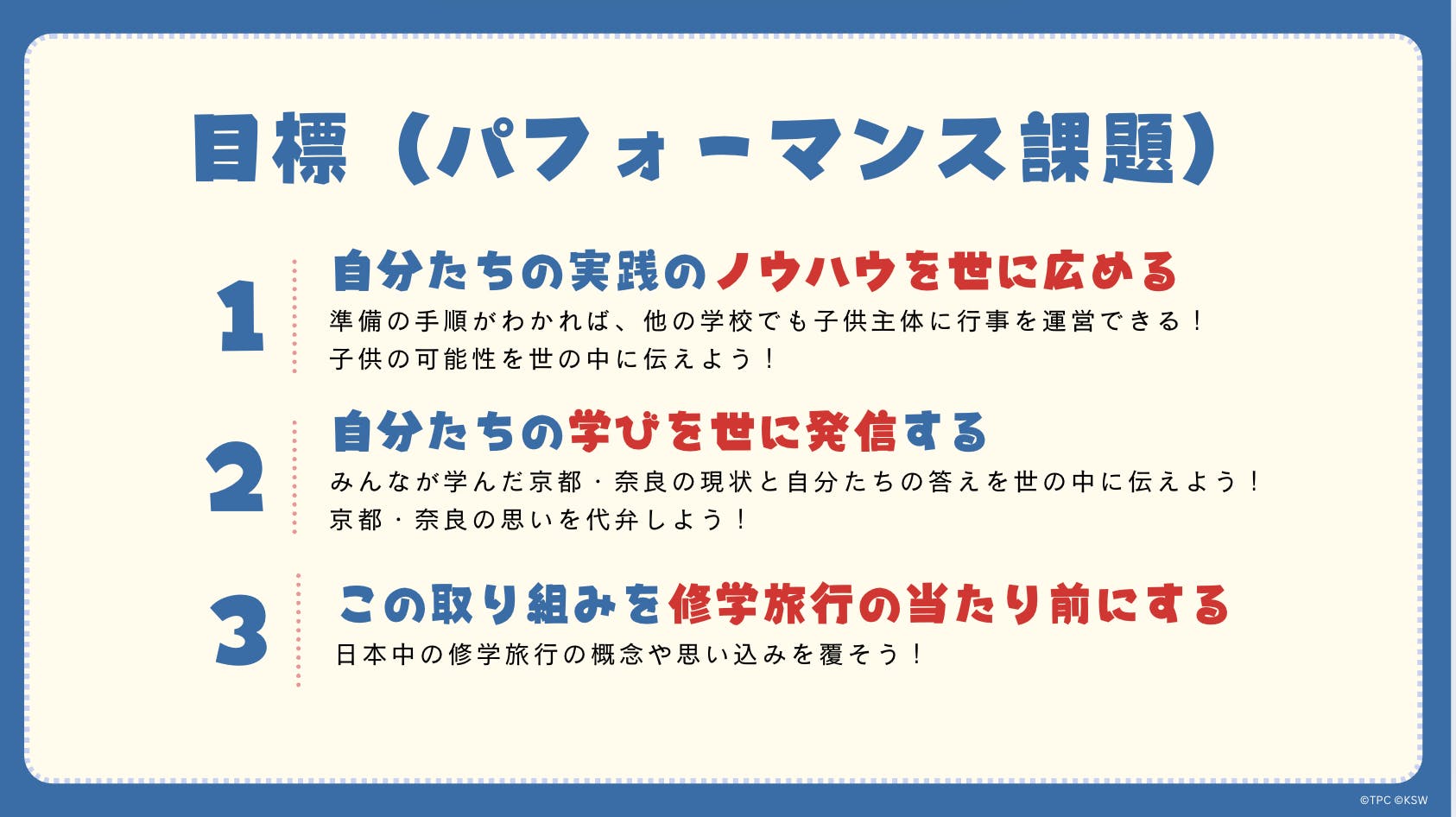 これまで、僕たちは先生達と協働し、学校内外で様々なプロジェクトを実施し、子供主体の活動の可能性を追求してきました。その中で得た経験を基に、ノウハウ本の内容を充実させるための準備として学級経営、運動会、修学旅行の運営、企画、実践を積んできました。今回のノウハウ本でも、修学旅行の実践を具体例として紹介したいと考えています。