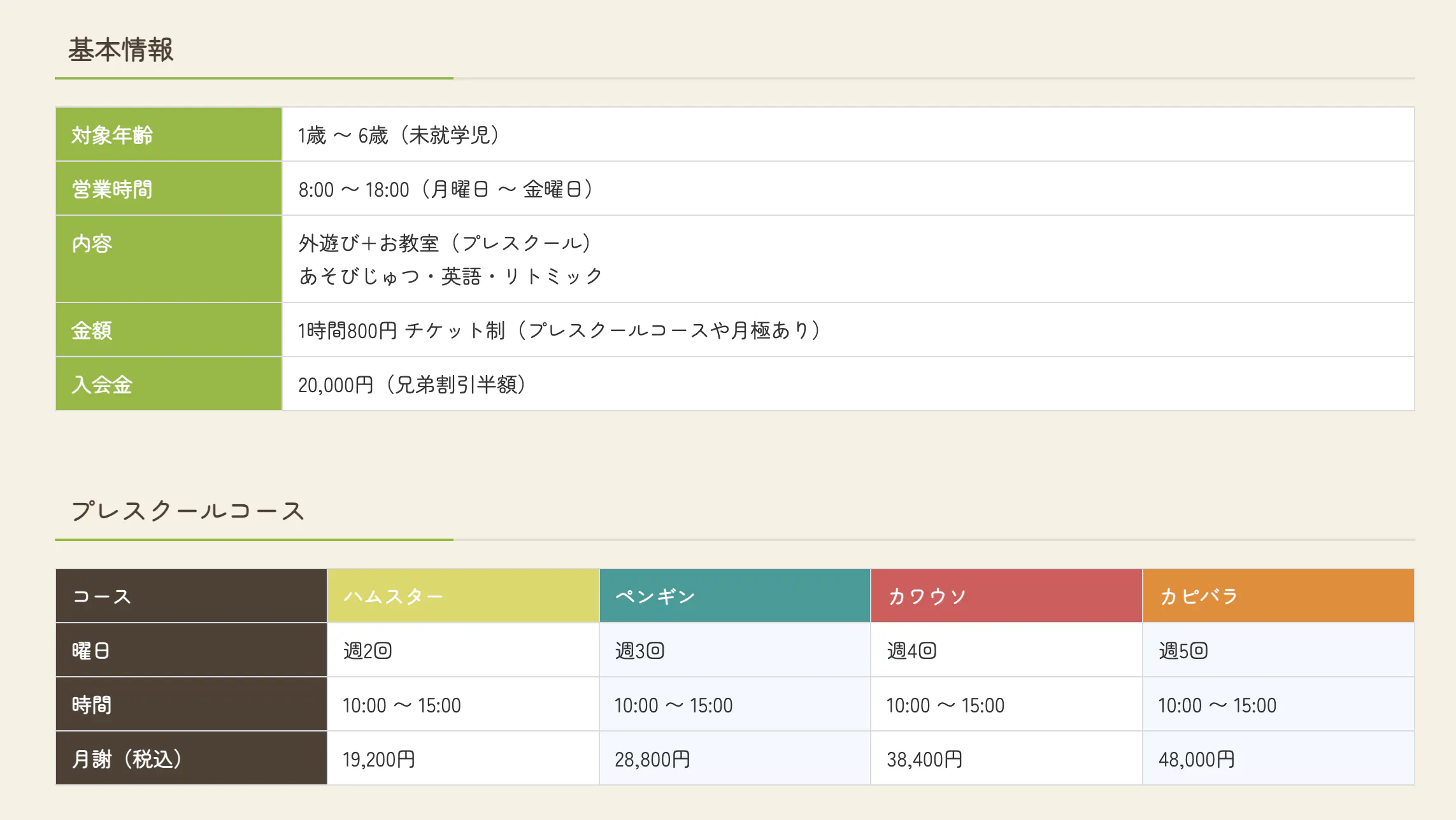 サービス内容: 外遊び+お教室(プレスクール)・あそびじゅつ・英語・リトミック