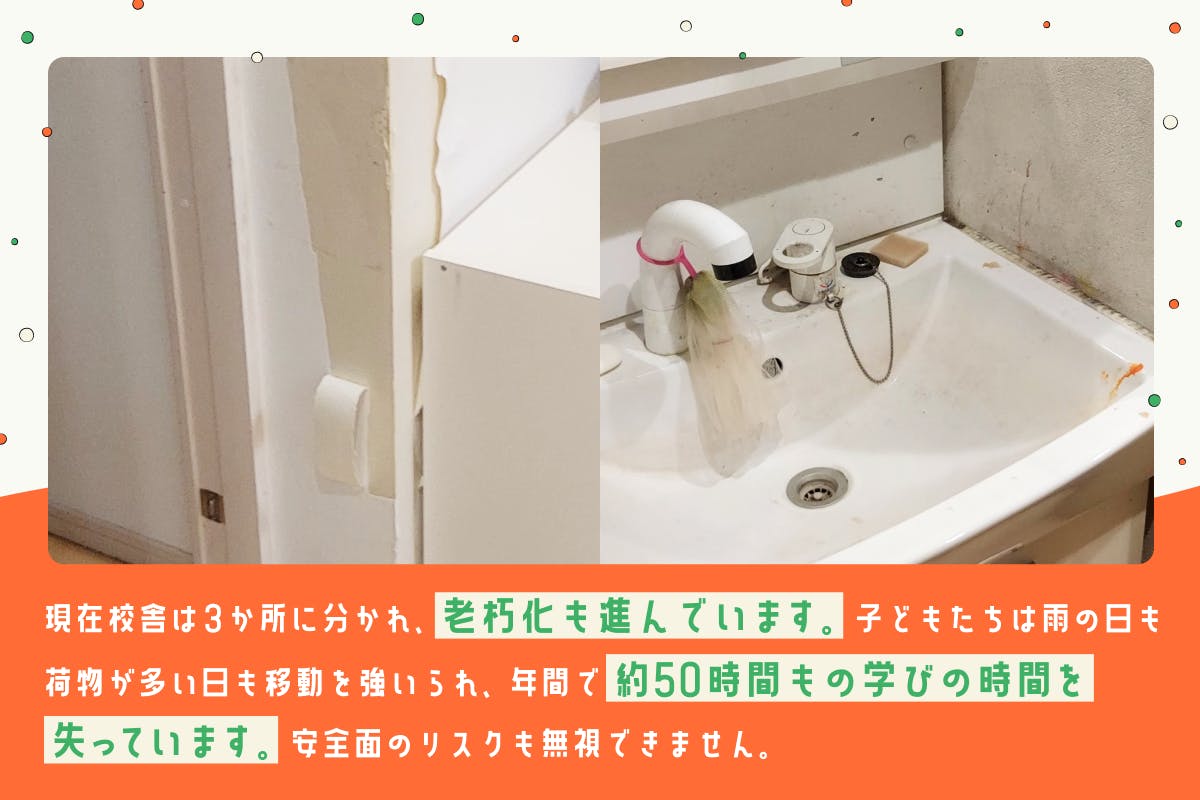 しかし開校から10年、多くのボランティア・スタッフに助けられて運営を続けてきましたが、【建物の老朽化による危険性】【移動による年間50時間のロスタイム】【交通事故・ケガのリスク】など、子どもたちの学びを取り巻く課題は限界に近づいています。