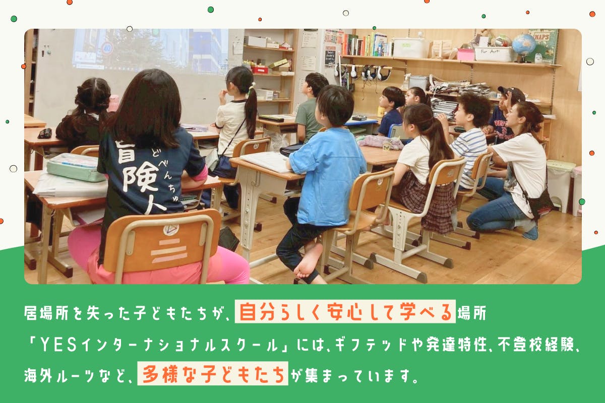 2016年にフリースクール(オルタナティブスクール)として現在横浜市内の3拠点にて運営している『YESインターナショナルスクール横浜』。ギフテッドの特性を持つ子、発達特性ゆえに一斉授業が苦手な子、定型発達でもYESの教育方針に賛同してくださっているご家庭の生徒、不登校経験のある子、海外ルーツを持つ子…など、従来の教育環境と合わなかったさまざまな子どもたちが集まり、一人ひとりにあった学習をしています。