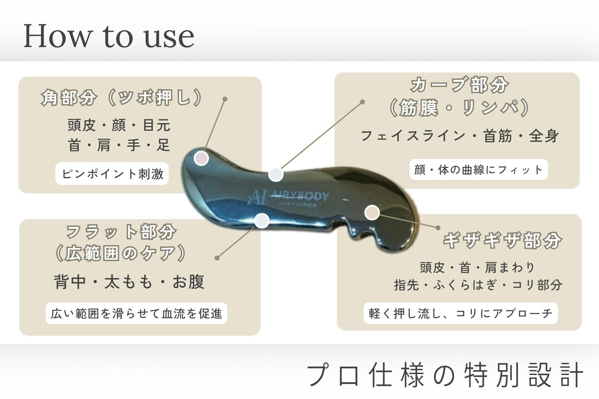 また今回デザインにこだわり「流す・押す」など、身体の様々な箇所に使用しやすい形状になっています。