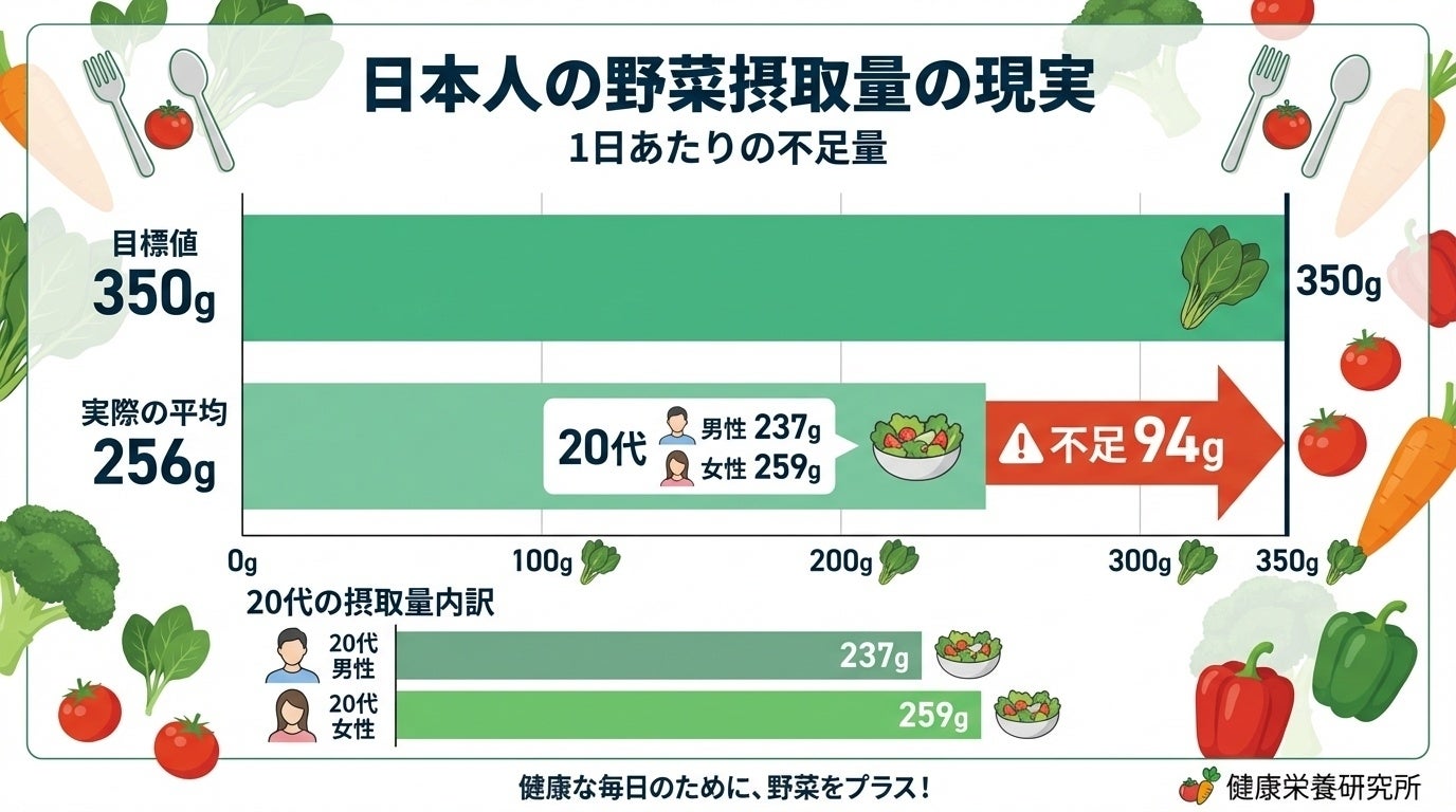 - 現代日本人の平均摂取量:256g(94g不足)