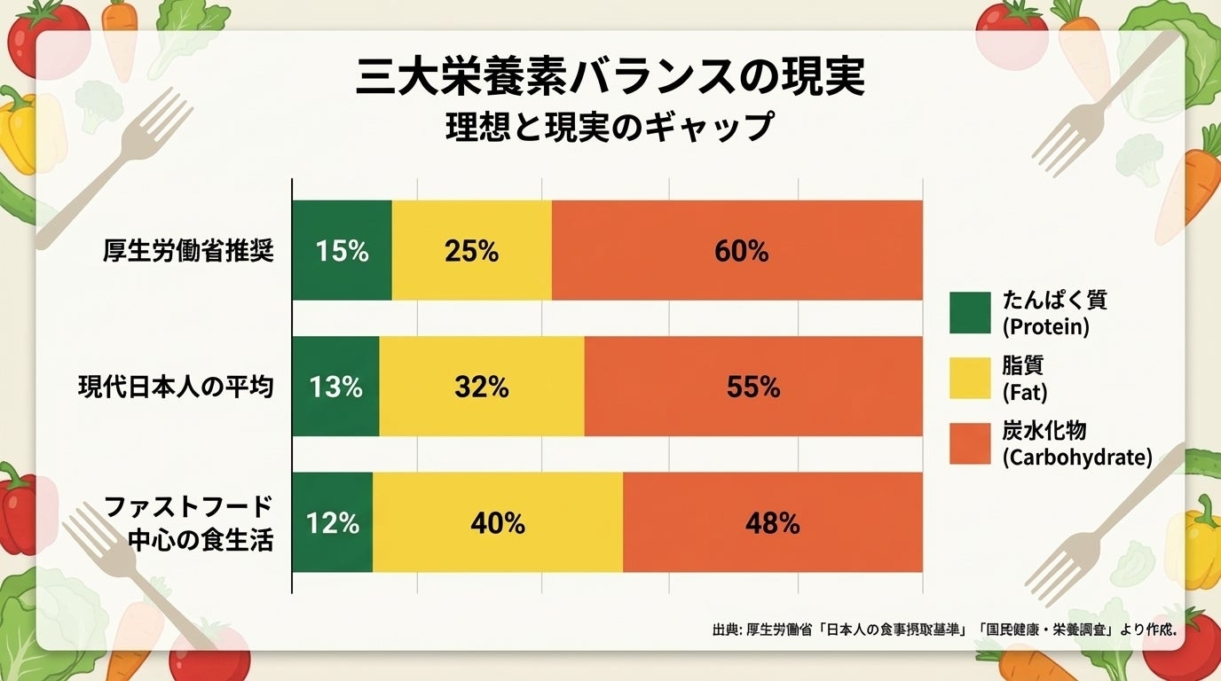 厚生労働省の最新データ(令和5年 国民健康・栄養調査)をもとに、現代日本人が直面している深刻な栄養問題をご覧ください。