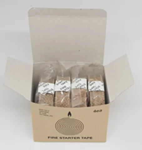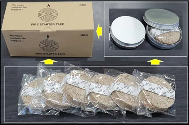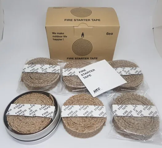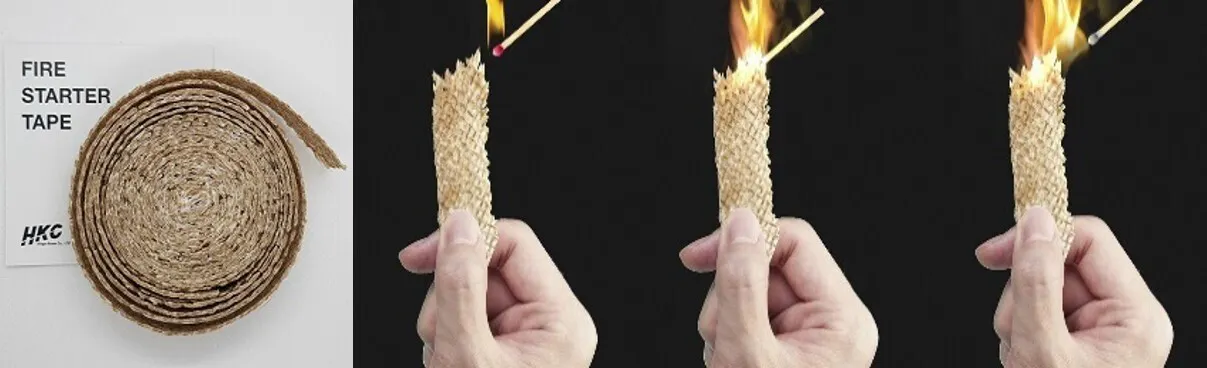 「Fire Starter Tape」 は、小さいサイズでも比較的長く燃えながら火力も強いテープ型の着火剤で、黄麻綿の塊を液状パラフィンに浸漬したまま硬化させて形成しています。