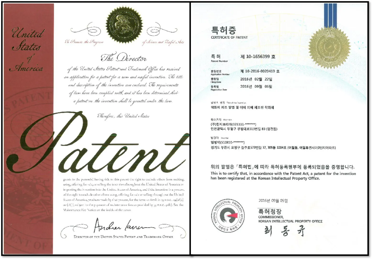 韓国と米国の両方で特許を取得しています。