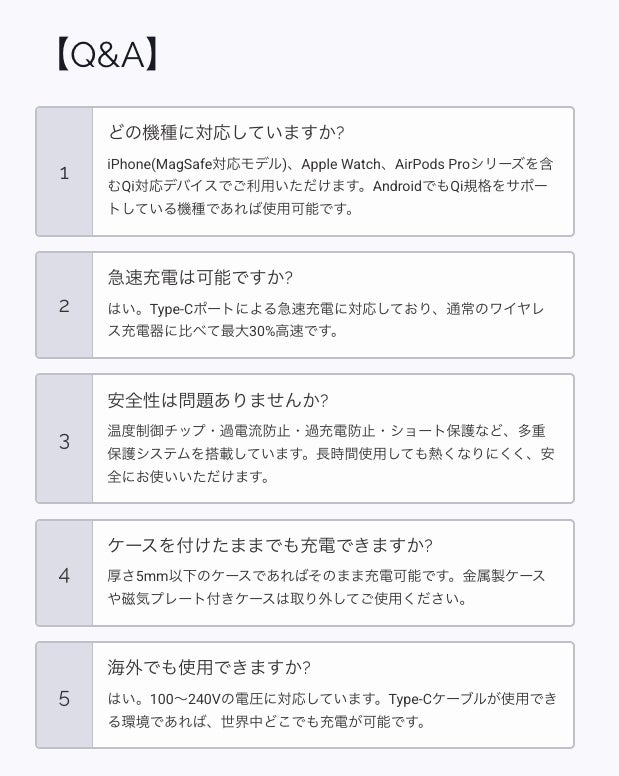 早割 25%OFF 100名限定 定価3,100円 →2,480円(税・送料込) 【内容】 ワイヤレスチャージャー×1 (配送時期) 商品到着は2026年1月を想定しております。 ※製造状況により出荷時期が遅れる場合がございます。 ※商品代を安くする為に工数削減をしており出荷連絡は致しません。活動報告をご覧ください本 商品のメーカー情報 製造国 -中国 Shenzhen Paisituo Technology Co., Ltd. ※この商品はOEMです。 商品概要について 商品サイズ 11.8X8.5 cm 素材 ABS + PC