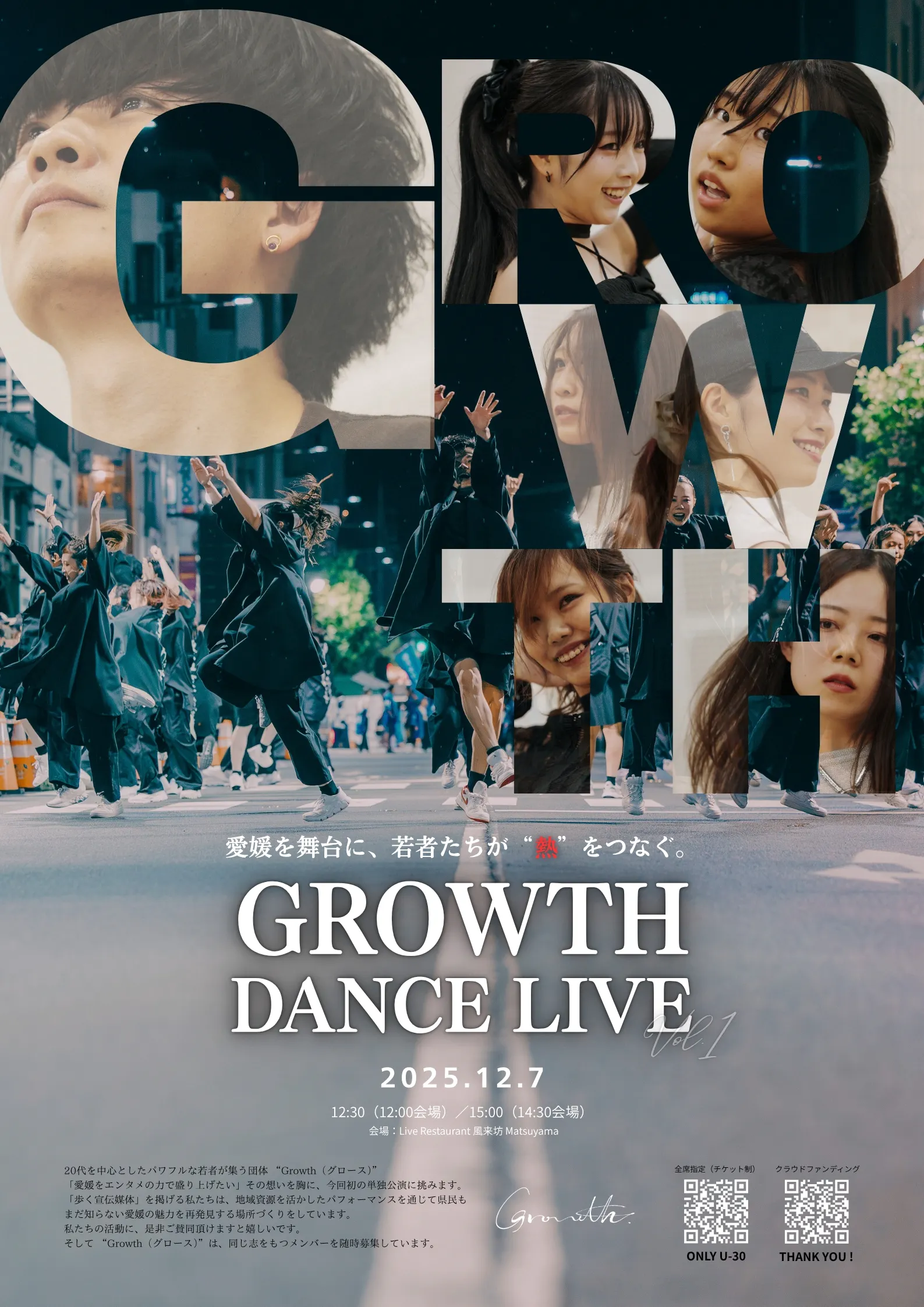 2025/12/05 20:23こんにちは!“歩く宣伝媒体” Growth(グロース)です。日頃よりクラウドファンディングやSNSなど、たくさんの応援をいただきありがとうございます!クラファン公開から早くも1ヶ月が経とうとしています。12/7の本番が近づき、Growth一同、より一層練習に熱が入っているところです。初めての単独LIVE、そして初めてのクラウドファンディングへの挑戦ですが、現在30名近くの方々にご支援いただき、暖かいメッセージにエネルギーをもらっています。本当にありがとうございます。そんな支援者の皆さま、そしてこれからGrowthのことを見つけてくださる皆さまに向けて、GDLに向けた活動をご紹介したいと思います。【リハーサル】今回のイベントでは総勢29名がそれぞれ合計19のチームを組み、90分のショーケースを作っています。プロダンサーの代表が振り付けを行うだけでなく、メンバー自身が選曲・振り付け・構成を行うナンバーもあります。8月9日の松山野球拳おどり終了後の打ち上げにて、メンバーへGDL開催をサプライズ発表。その後すぐに運営委員会が立ち上がり、各曲に出演するメンバーを募り、、と野球拳おどり以上に活発に活動した3ヶ月となりました。メロウなJAZZからガツンと決めるHIPHOP、生歌唱×ダンスパフォーマンスにアイドルメドレーなど、個性際立つナンバーの数々にきっと観客の皆さんにも楽しんでいただけると思います。【GDLポスター完成!!】GDLはメンバー内で構成された運営・広報委員会が中心となって、クラファン企画やSNS発信などを行っています。定期的にミーティングをしながら、どうすればもっとたくさんの方にエンタメを届けられるか、楽しんでいただけるか、地域を盛り上げられるか、熱い議論を交わしています。そんな中、こちらもメンバー内で試行錯誤して制作した、GDLのポスターが完成しました!!現在愛媛県内各地の店舗様・企業様に掲出していただいています!<ポスター掲出場所一覧>・網元 (居酒屋)・正夢 (居酒屋)・うみいろ(ハンバーガー)・BURGER BULL (ハンバーガー)・しゃかりき家(居酒屋)・ふしおん(スペインバル)・セントラル(立ち飲み)・猫八 (居酒屋)・猫殿 (居酒屋)・蜜彩(どらやき)・abuku balloon (バルーン)・伊よ美(創作和食)・泰輔29(焼肉)・シムデザイン (建築デザイン事務所)ぜひ見かけた際は、SNSでシェアしてください!!改めて、GDLは私たちだけで実現できるものではないことを実感しています。ご協力いただいている皆さま、本当にありがとうございます!!さて、いよいよ今週日曜日に迫ったGrowthDanceLive Vol.1。会場に来ていただける方々はもちろん、後日映像で見てくださる皆さんにも1人残らず楽しんでいただけるよう、全員で全力で頑張ります!!クラウドファンディングも残りおよそ2週間となりました。GDL後もGrowthは『エンタメで地域を盛り上げる』ために県内外で様々な活動を行っていきますので、引き続き応援よろしくお願いします!!1部まだ空きございます!!↓チケットご予約はこちらからGDL Vol.1チケット予約フォーム【GrowthDanceLive vol.1】◉日時:12月7日(日) 1部:開場12:00 開演12:30 2部:開場14:30 開演15:00◉場所:Live Restaurant 風来坊 Matsuyama(愛媛県松山市二番町1丁目8-2)\ 公式Instagram もチェックお願いします!!/ もっと見る