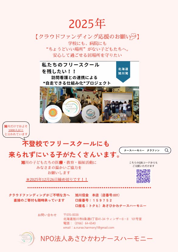 旭川の子どもたちにとって安心で安全である居場所を作るため、応援をよろしくお願い申し上げます! フリースクールひなたぼっこの立ち上げを陰ながら見守ってきた一人として、大きな挑戦を応援します!