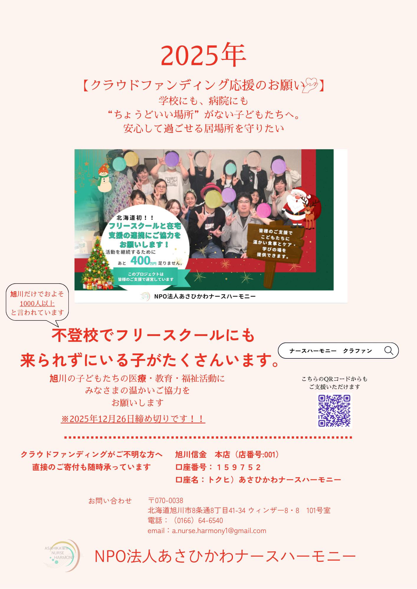 その「ちょうどいい場所」をつくってきたのが、私たち NPO法人あさひかわナースハーモニー です。