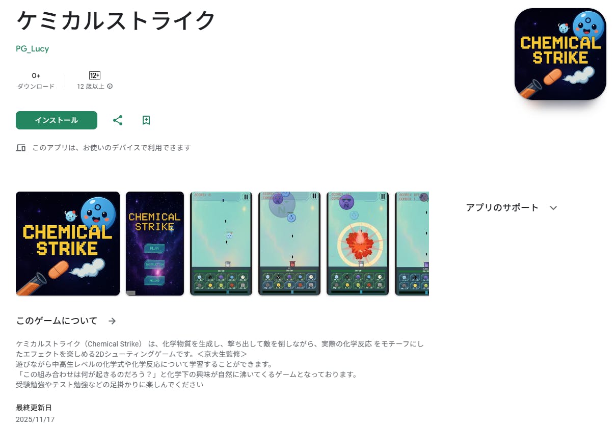 2025/11/17 20:23化学系シューティングアプリ「ケミカルストライク」のテストをはじめましたつきましてはテストを行っていただける方がいましたら幸いです。【クローズドテストご協力のお願い】このたび、GooglePlayStoreでアプリを配信したく思っております。配信のためには12人のAndroidユーザーにクローズドテストという簡単なテストに参加していただく必要がございます。つきましてはもしお手伝いいただける方がいれば以下の手順に従ってテストに参加していただければと思います。どうぞよろしくお願いいたします。【アプリ名】ケミカルストライク【アプリ概要】化学物質を作り、敵の化学物質と反応させて倒していくシューティングゲームです。化学を知らない人も遊びながら化学を学んでほしいという思いで作りました。反応のレベル的には中学高校レベルのものがほとんどです。【クローズドテスト参加手順】①グーグルグループに参加https://groups.google.com/g/chemicalstrike②アプリをインストールhttps://play.google.com/store/apps/details?id=com.PikarunGames.ChemicalStrike③15日以上アプリを削除せずに置いておく 可能であれば ・1日数分のプレイ ・PlayStore上等でフィードバック をして頂ければ幸いです。【最後に】今回が初めてのアプリ配信となります。もしお気づきの点やご意見などがありましたら、ぜひ教えていただけると幸いです!どうぞよろしくお願いいたします。 もっと見る