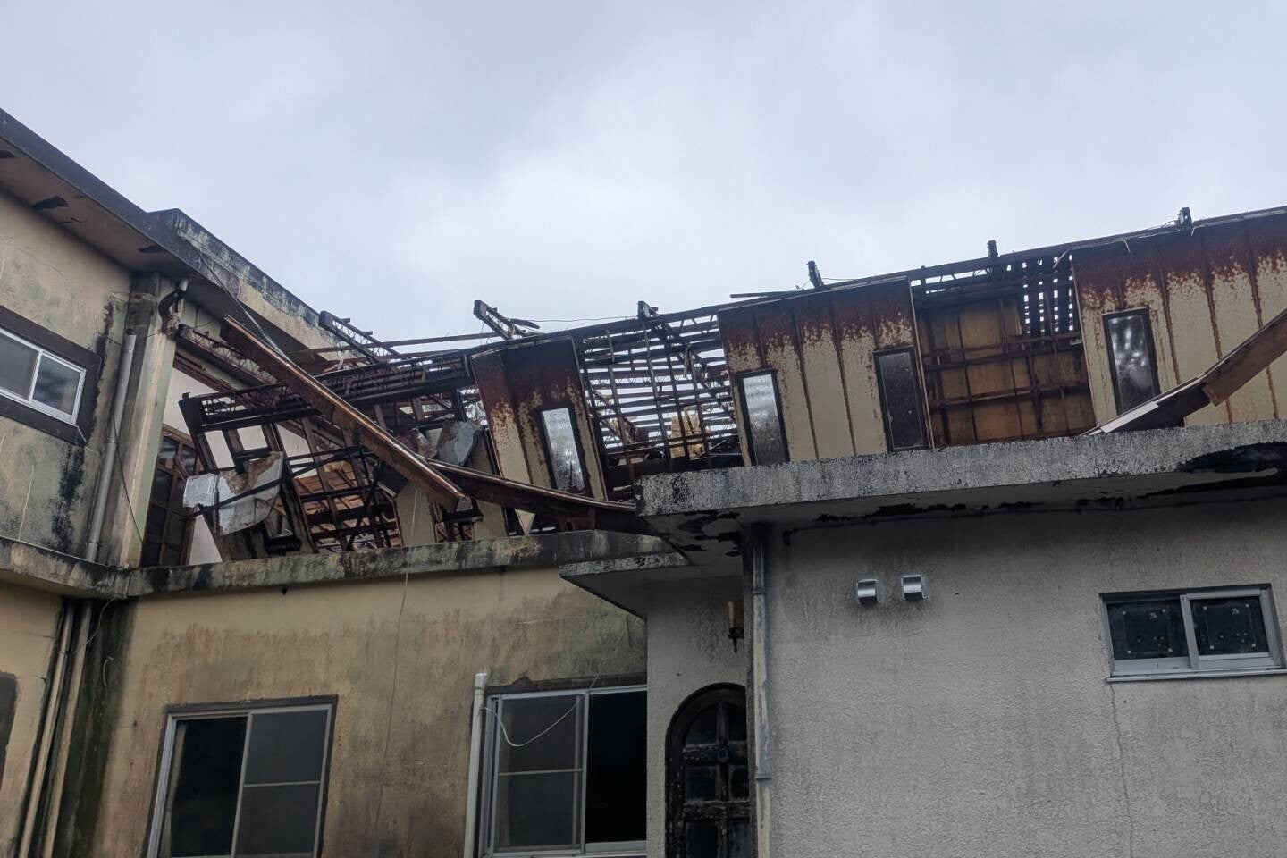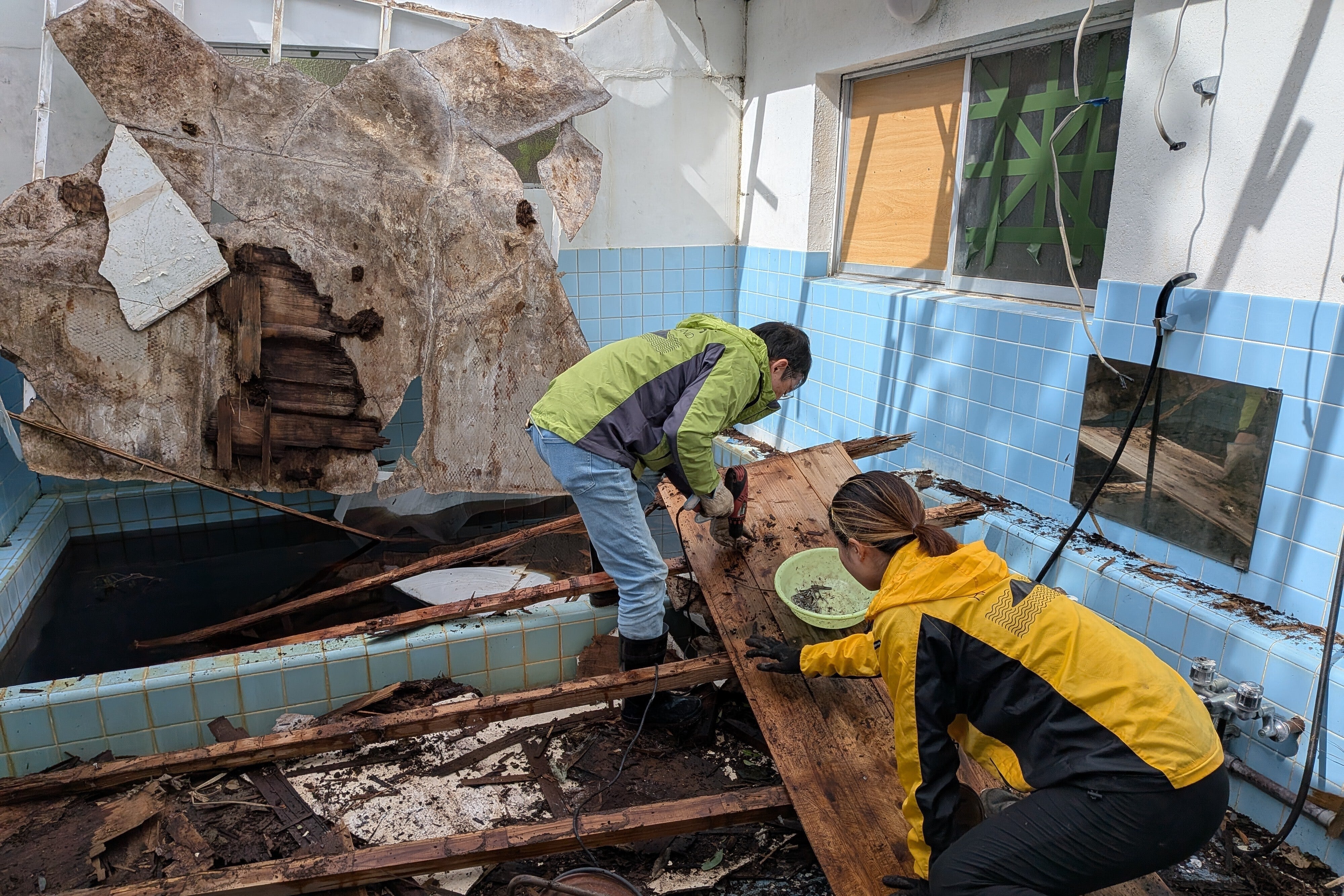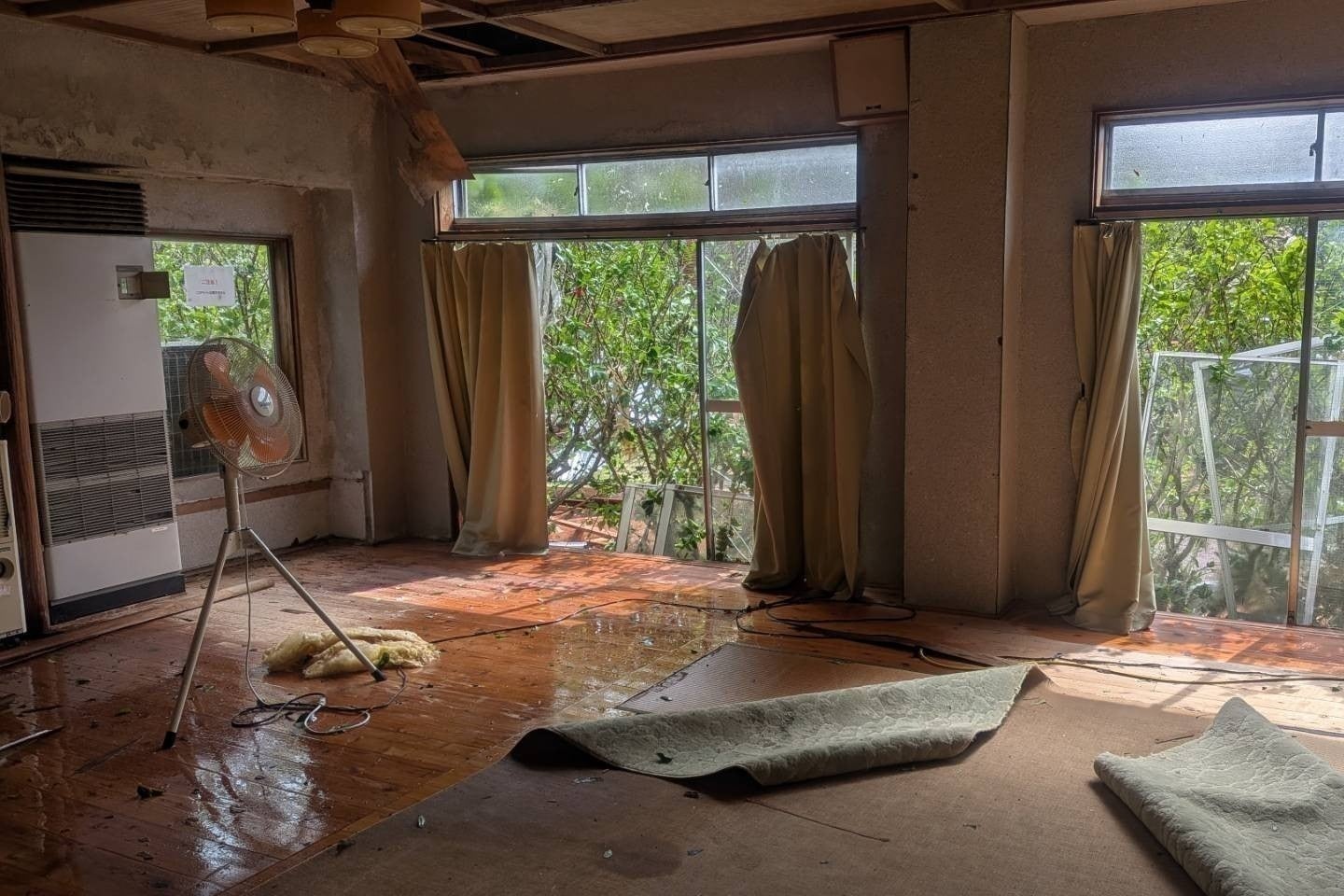 先の台風22号、23号により施設に大きな被害を受けました。2階にあった食堂の屋根がすべて剥がされ、下の宴会場、ホールに大量の雨漏りが起こり、使えなくなりました。練習に来る人たちが使うトイレも給水管が破損し現在使用不能。浴場も壊されました。再建するには自力では到底無理と思われます。このままでは太鼓の練習場また、宿泊施設としての再開は無理です。どうかお力を貸していただけませんでしょうか。