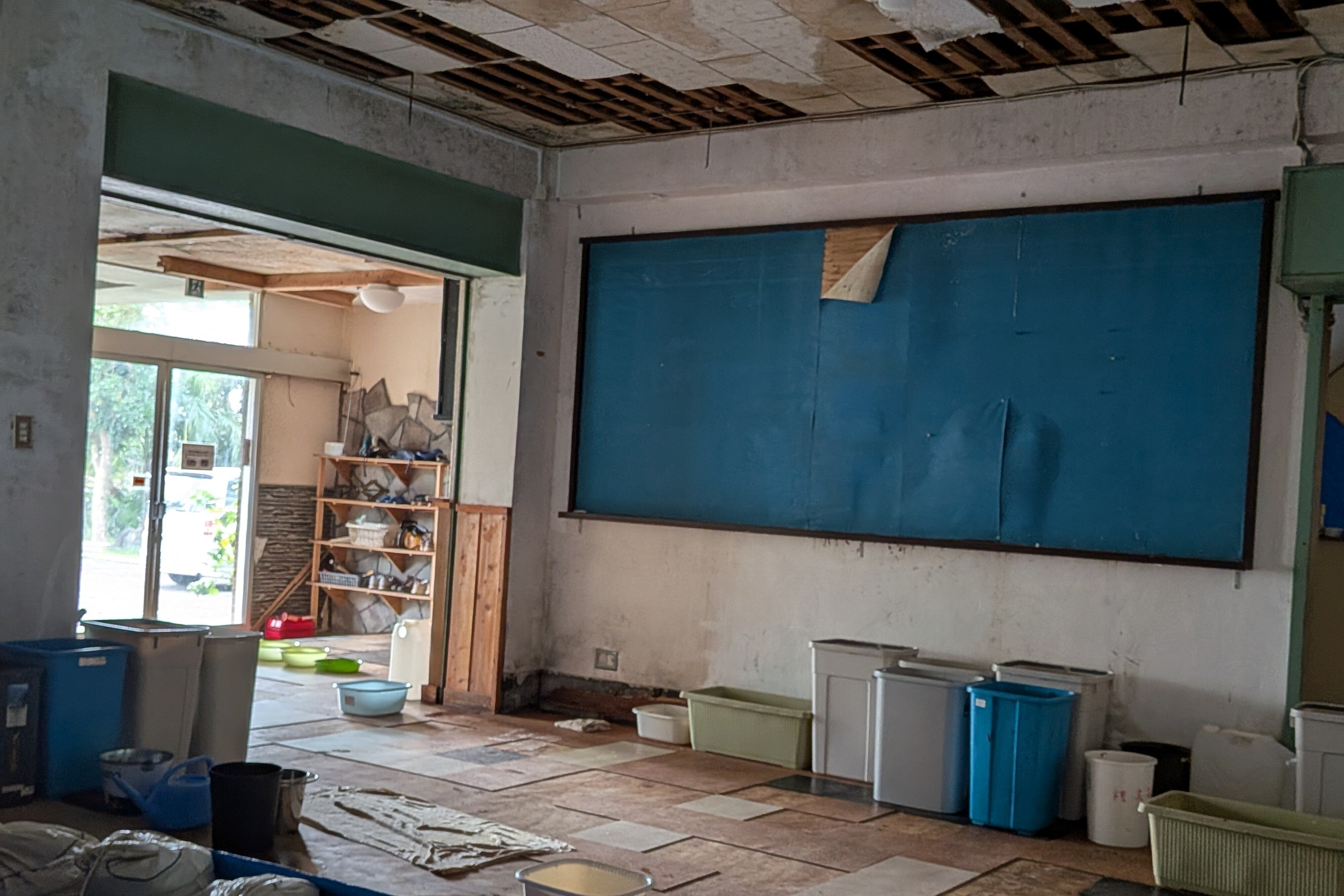 練習場だった宴会場はサッシが外れ、水浸しです。