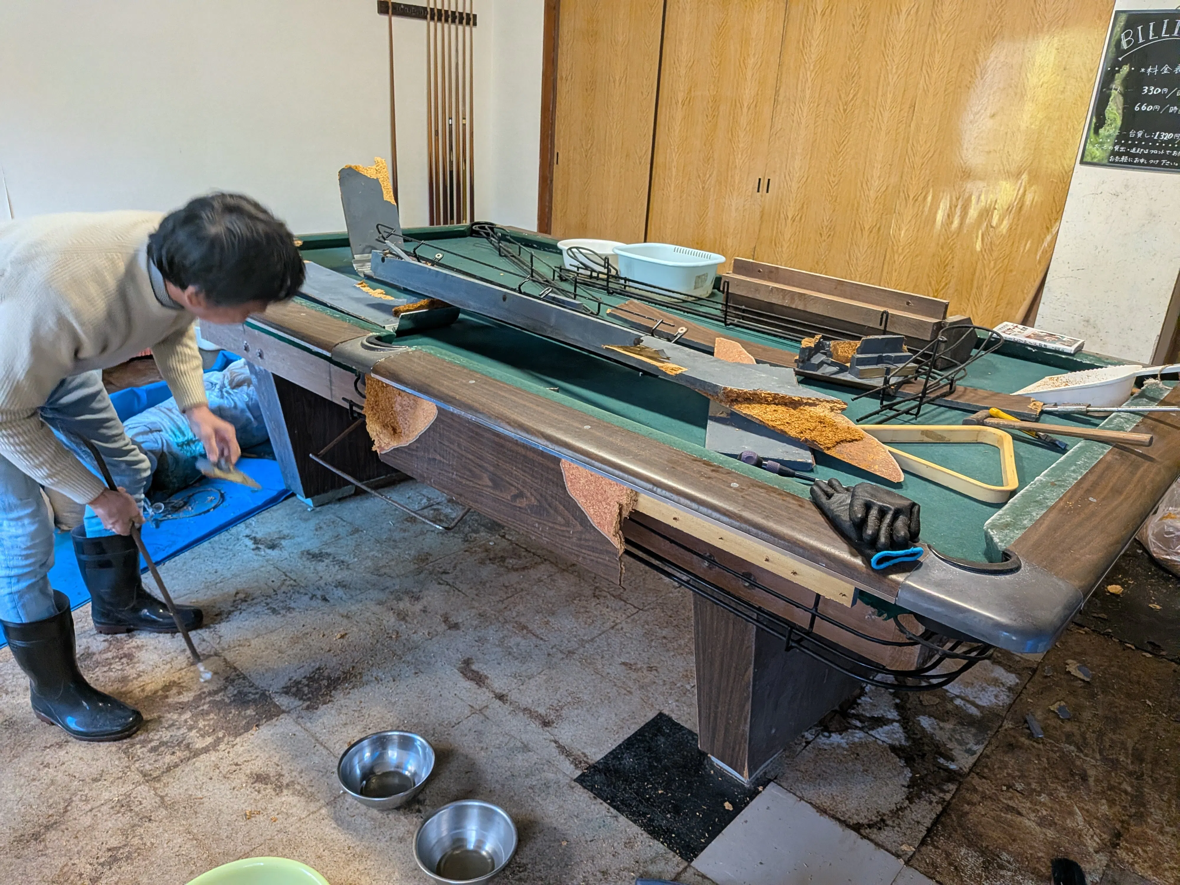 2025/12/16 22:192階の食堂が大破して1階のホールへ雨漏りのため、長年お世話になったビリヤード台も処分する事に。業者さんに片付けをお願いしていますが、出来ることは自分たちでしようと分解をしました。重たいビリヤード台はなかなか手ごわいです。ベースの部分はさすがに動かすことが出来ず、ここは依頼した業者さんにお願いします。それと、食堂の解体の見積もりが来ました。息をのむ金額です・・。それでも前に進まなくちゃ。 もっと見る