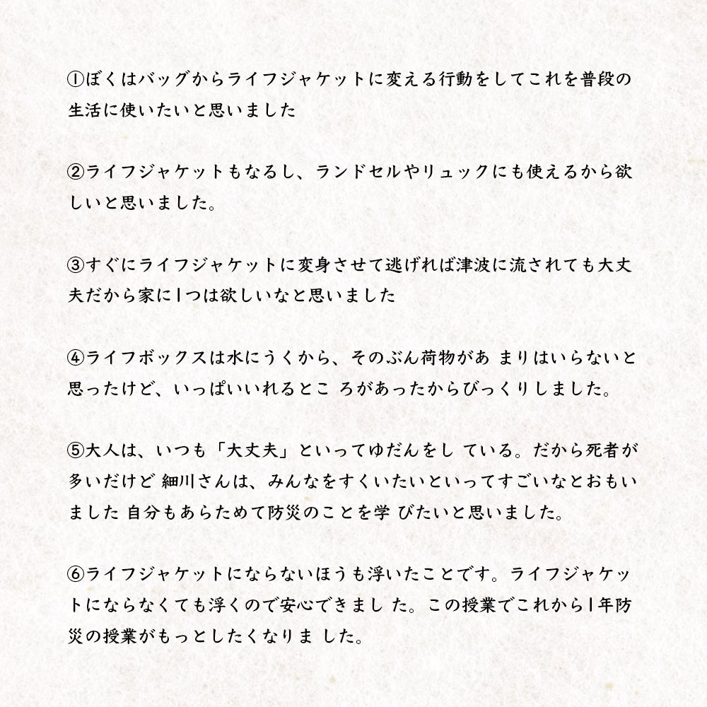 • いつもLIFE BOXへのご支援・応援をいただき、ありがとうございます。今回の活動報告では、LIFE BOXの開発背景と、製品が完成するまでの道のりを少しお話しさせてください。なぜこのバッグを作ろうと思ったのか私は消防団に25年間在籍し、何度も河川氾濫の現場を経験してきました。水害の凄まじさは、実際にその場に立たなければわからないものがあります。そして東日本大震災で見た津波の衝撃映像は、今でも脳裏に焼き付いています。一方で、本業ではドクターヘリや救急車で使用される医療救急バッグを手がけてきました。「現場で人の命を支える道具をつくる」――その仕事を続けるうちに、「災害が起こる前から命を守るバッグをつくりたい」という思いが徐々に確固たるものになっていきました。そして2024年1月、能登半島地震で再び津波の脅威が現実のものとなったとき、開発をスタートすることを決意しました。もっとも苦労したこと――「普通のバッグ」と「救命胴衣」を両立する開発において最大のテーマは、「普段使いする通勤・通学バッグが、そのまま救命胴衣に変形する」 というコンセプトをどう実現するか、でした。「変形する」というイメージはあっても、その具体的な仕組みがなかなか決まらず、最初の壁にぶつかりました。転機になったのは、毎朝工房の前を通学する学生たちの姿でした。彼らの多くがボックス型(スクエア型)のリュックを背負っていることに気づき、「この形なら救命胴衣型に変形しやすい」というアイデアが閃いたのです。解決しても、また新たな問題がしかし、形のコンセプトが決まってからも試行錯誤は続きました。最も頭を悩ませたのは、「バッグとしての収納力」と「浮力体としての安全性」のバランスです。収納力を重視すれば浮力体を小さくせざるを得ない。逆に浮力を優先すれば、日常使いには不便なバッグになってしまう。この問題の解決に、開発期間1年9か月のうち1年以上を費やしました。計4回の設計改良を行い、そのたびにプールでの浮力テストを実施。試作と検証を繰り返した末に、ようやく現在のバランスに辿り着きました。「より速く、より確実に」――昨年モデルからの改良点浮力と収納のバランスが定まった後も、「水害時により短時間で救命胴衣状に変形できるか」という課題に取り組みました。昨年モデルからの主な改良点は以下のとおりです。マチのファスナーがスムーズに開くよう、バッグのシルエットを見直し各部のアールを大きくし、縫製箇所も改善肩ベルトを素早く脱着できるよう、細めのDカンと口の広いナスカンに変更取り扱い説明書に変形手順を明記肩ベルトや股ベルトを滑りやすい素材に変更これらの改良を経て、実際に鳥羽小学校の贈呈式では4年生の女子児童が1分7秒でLIFE BOXを変形・装着して見せてくれました。子どもの手で1分台を達成できたことは、開発チームにとっても大きな手応えでした。子どもたちが教えてくれたこと2025年6月、三重県鳥羽市立鳥羽小学校の4年生30名を対象にLIFE BOXを使った防災授業を実施しました。神戸市の特定非営利活動法人SEEDS Asiaと協力し、プール授業では子どもたちが実際にLIFE BOXを変形・装着して浮かぶ体験をしてもらいました。その後、子どもたちからバッグへの改良アイデアや要望を直接聞き取り、その声を反映した新型LIFE BOXを5本製作して贈呈。この取り組みはNHK・神戸新聞・中日新聞にも取り上げていただきました。また同年10〜11月には大阪府立桜塚高等学校でも防災授業を実施。生徒自身がLIFE BOXを救命胴衣に変形・装着するという体験を通じて、水害時の対処法を学んでもらいました。これからへの想いLIFE BOXには、バッグ製作の知識と技術、消防団25年間の経験、そして救急バッグメーカーとして培ってきたすべてを詰め込みました。将来的には、南海トラフ地震・日本海溝千島海溝地震の津波対策、線状降水帯による河川氾濫対策として、太平洋沿岸部や国内主要河川流域の小中高校で学校指定バッグとして採用されることを目指しています。さらにいつか、水害で苦しむ世界各国の人々のもとにもLIFE BOXを届けたいと願っています。皆様のご支援が、その一歩一歩を前に進める力になっています。引き続きどうぞよろしくお願いいたします。Maru Su Bags 代表 細川 晋 もっと見る