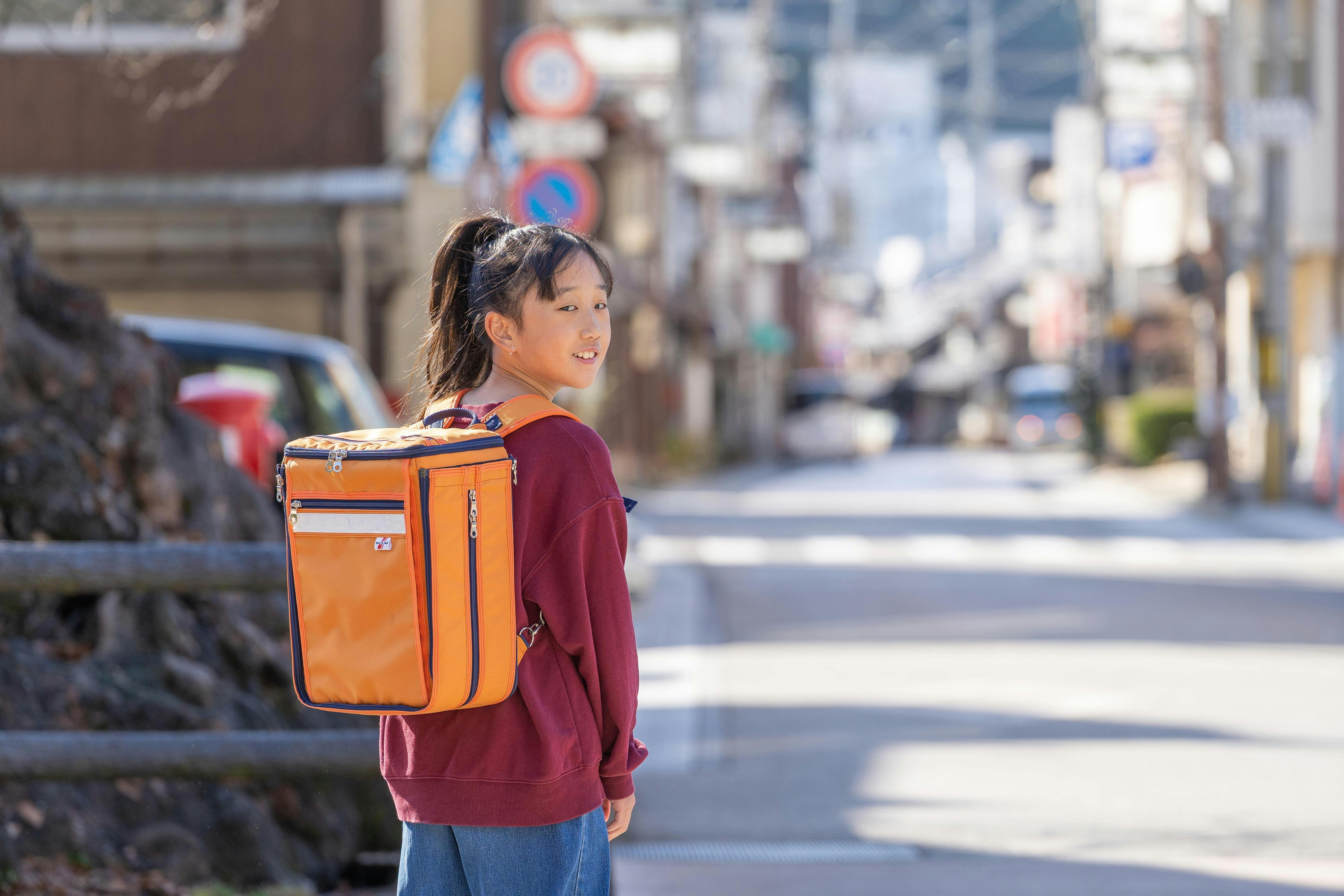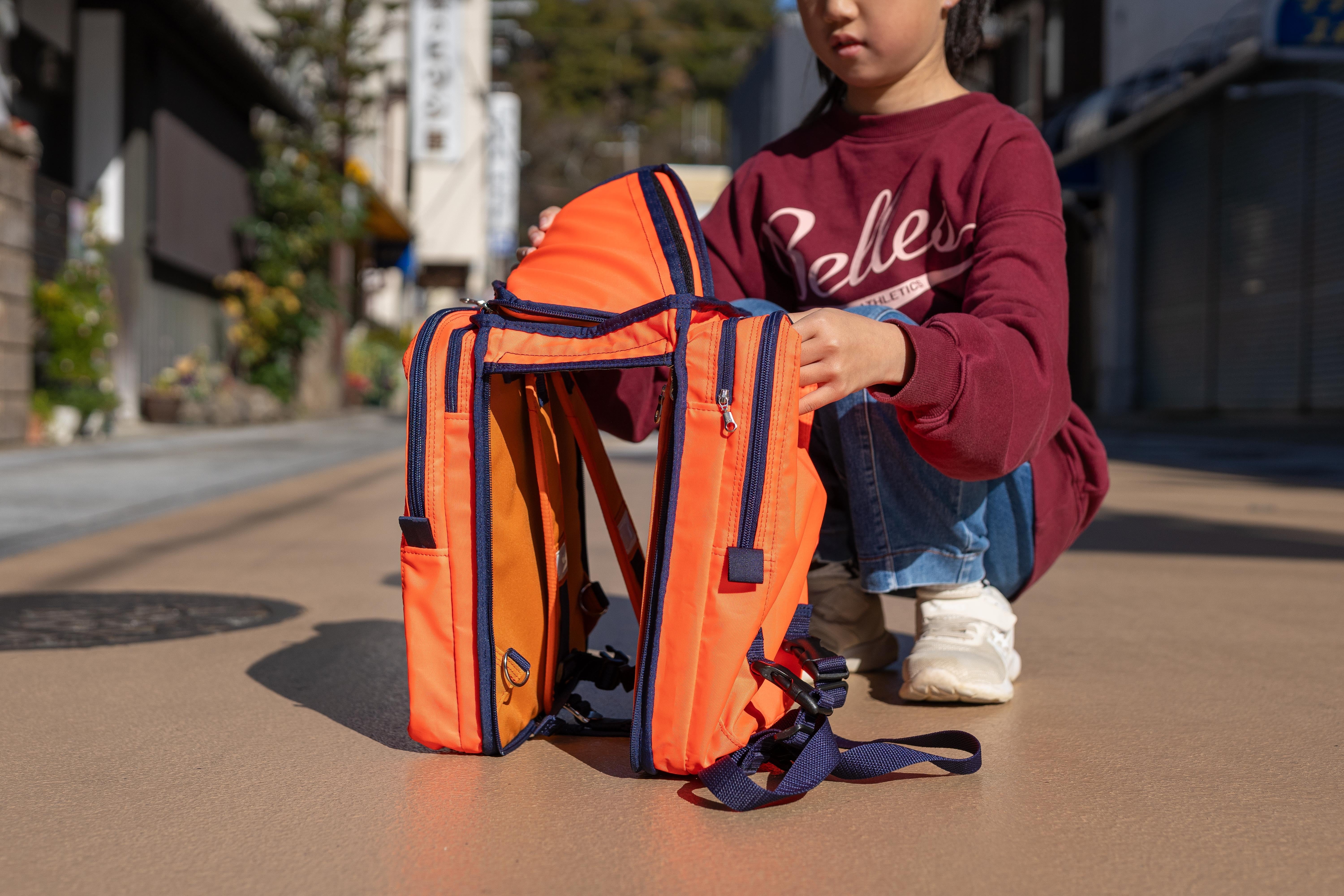 表側は日常の通学・通勤に馴染むデザインと容量を備え、教科書やノートPC、書類、部活動や仕事道具もしっかり収納できます。一方、裏地や一部パーツには視認性の高い蛍光色や反射材を用いて、薄暗い状況でも周囲から発見されやすいよう工夫しました。