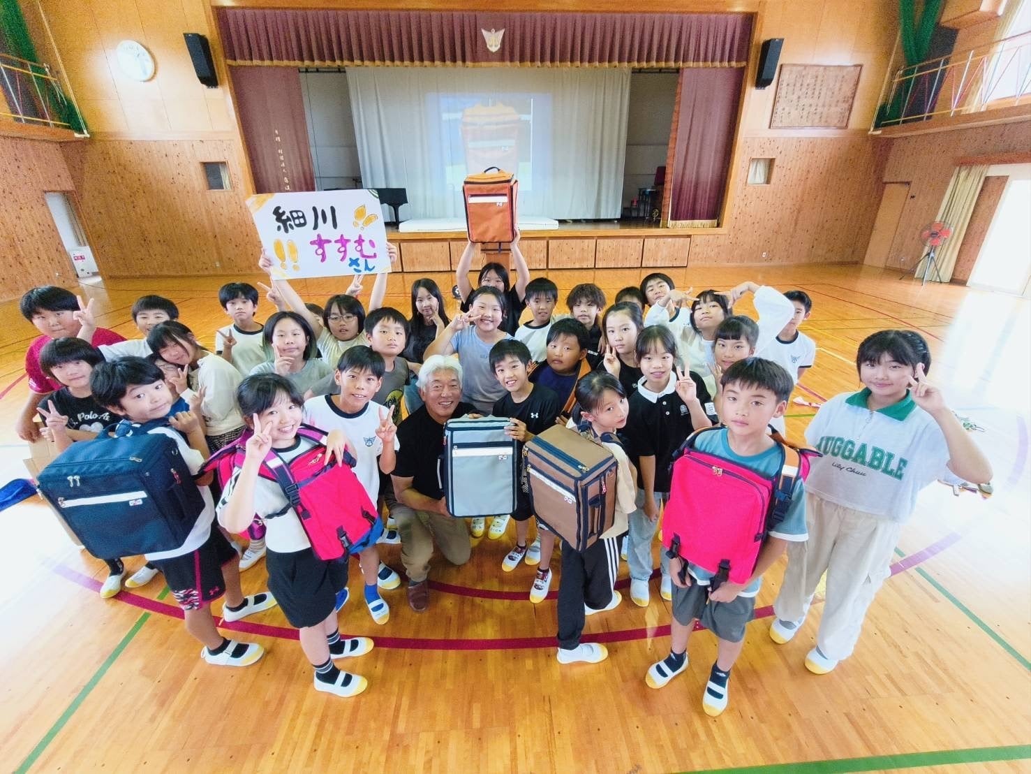 2025年6月23日、4年生の教室にて防災授業を実施しました。授業では、LIFE BOXの説明と実演を行い、「津波が来たらまずは高所へ逃げることを最優先する」ことを伝えました。そのうえで、避難の際には素早くLIFE BOXを変形して装着してから逃げることを説明しました。授業後には、子どもたちからバッグの改良案や要望を聞き取り、その内容を盛り込んだ新型LIFE BOXを5個寄付することを約束し、細川は帰宅しました。