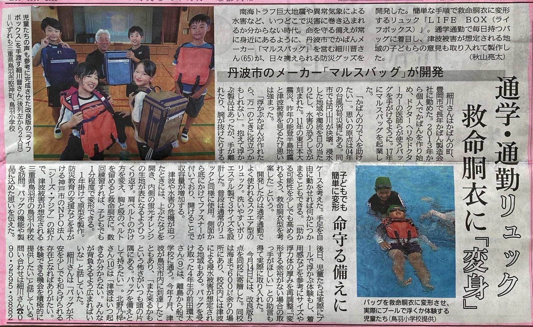 この取り組みは新聞にも大きく掲載され、「通学・通勤リュックが救命胴衣状に変身する」「ライフジャケット機能の通学リュック」として紹介されました。地域の皆さんにとっても、通学カバンと防災の新しい可能性を感じていただける機会となりました。