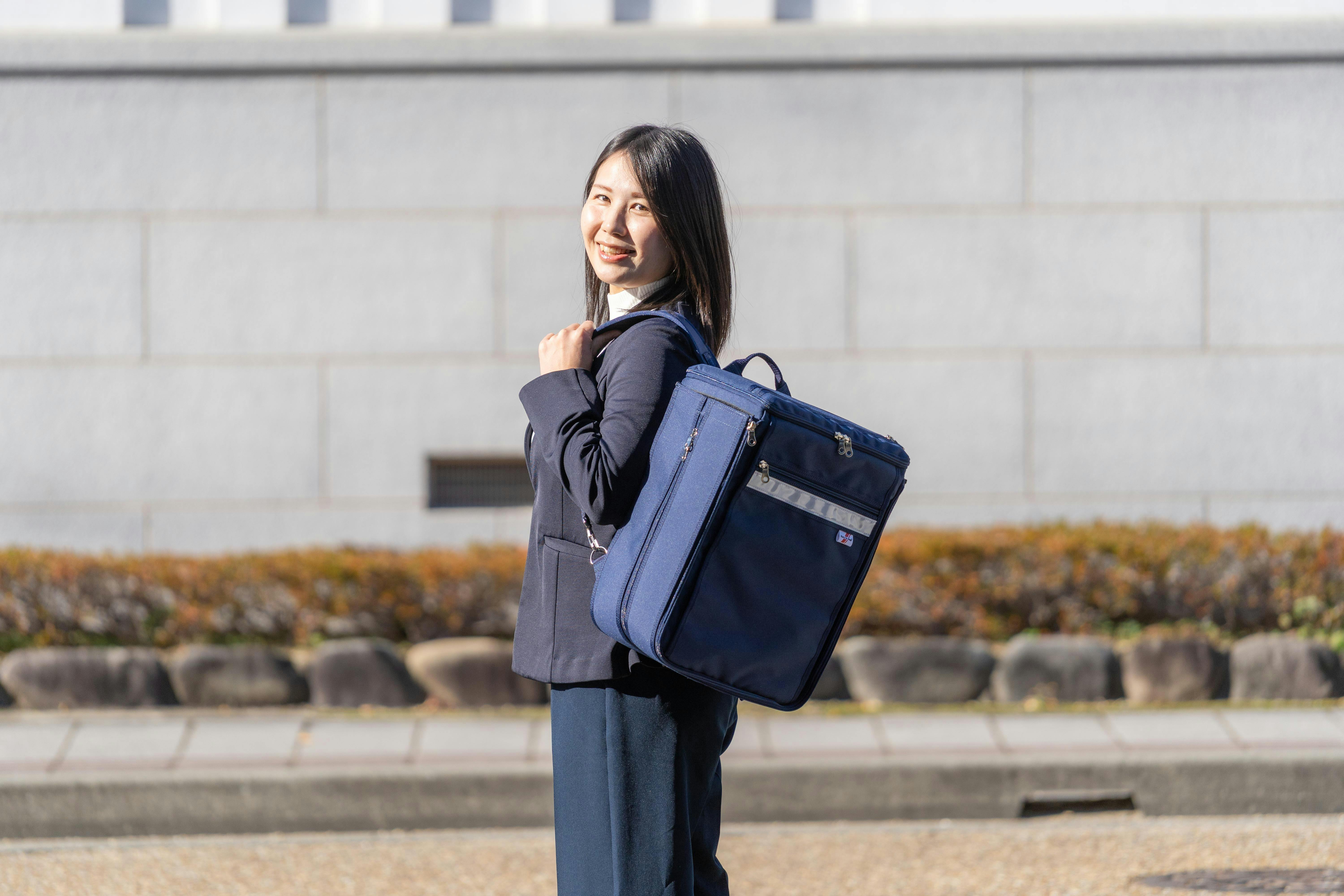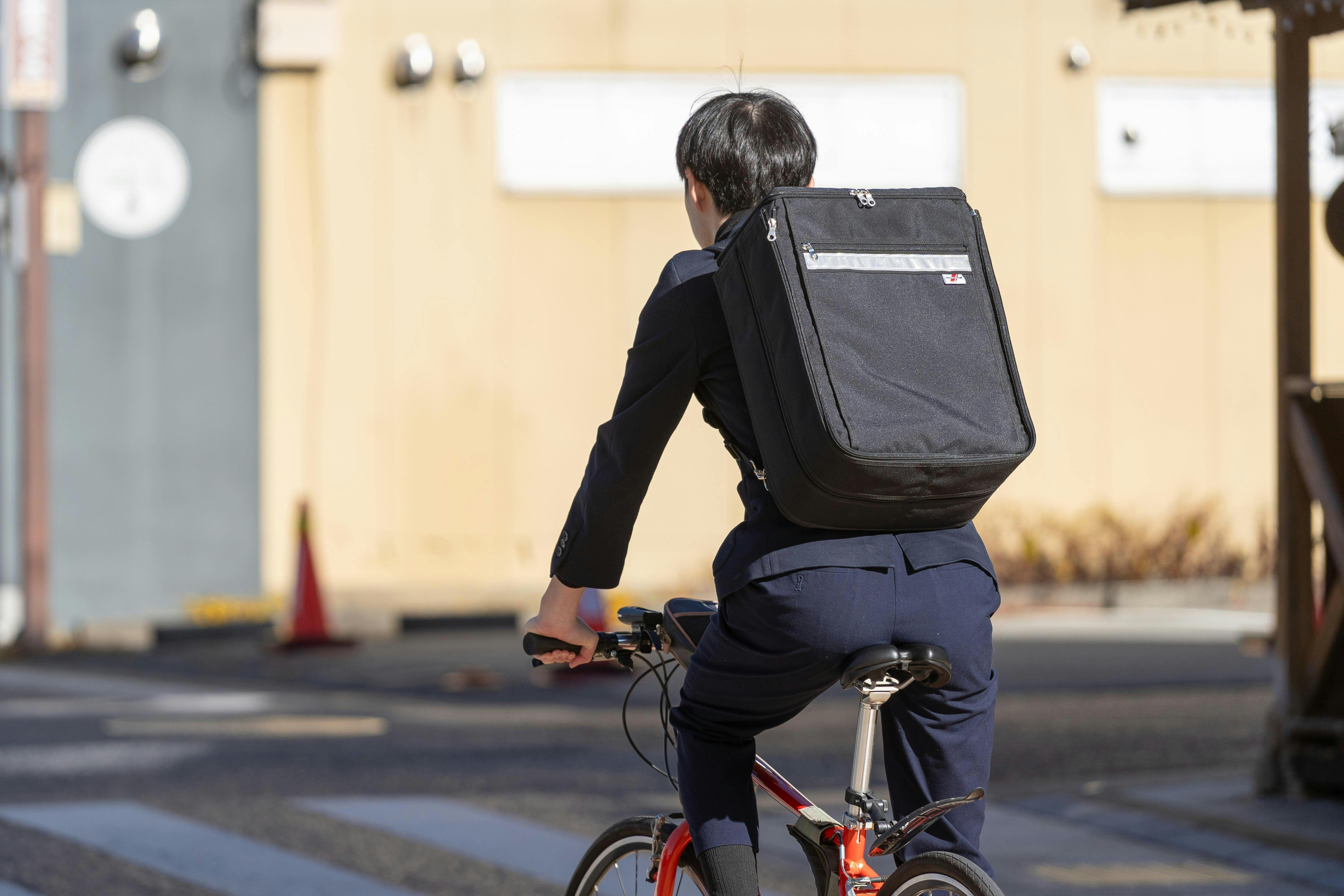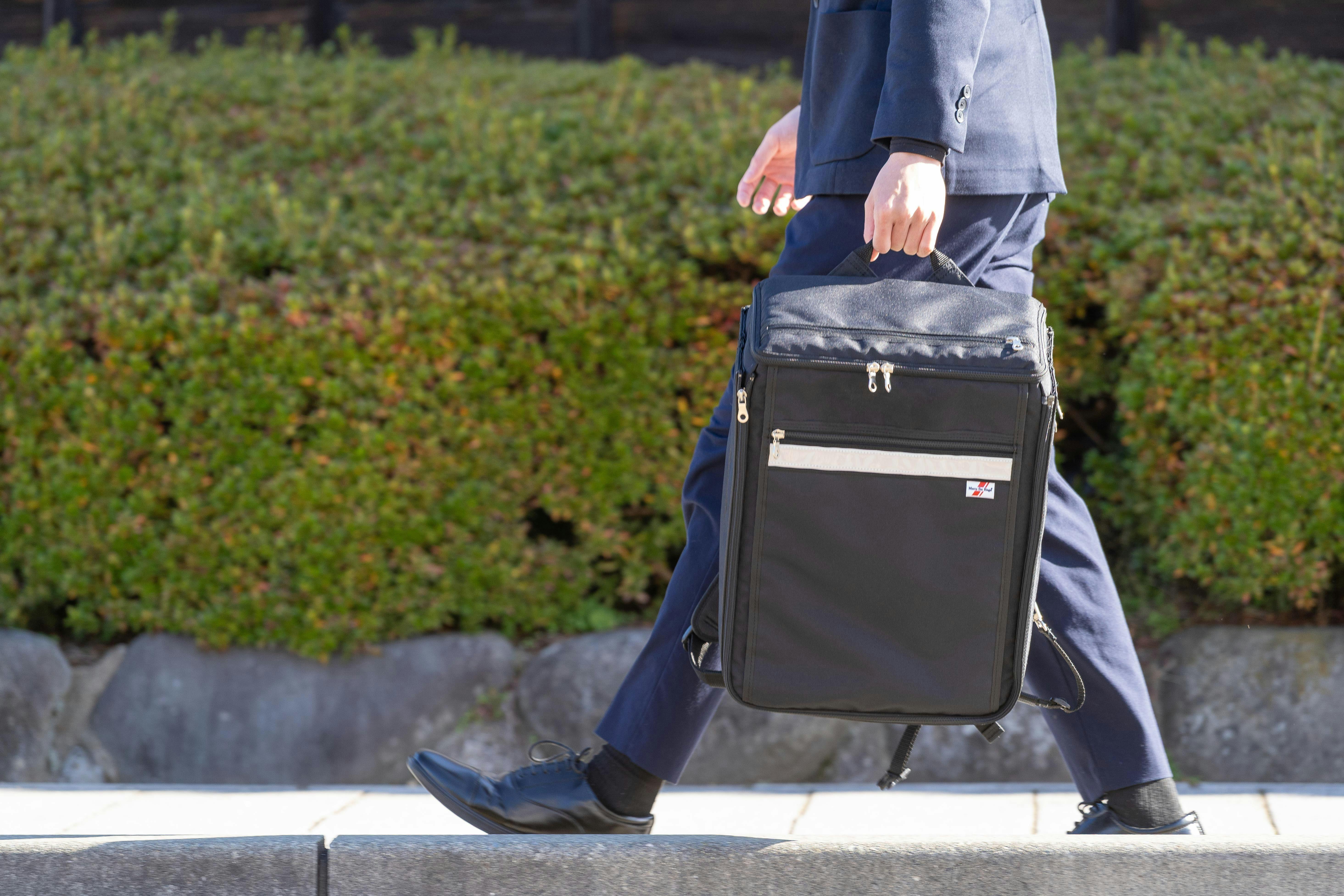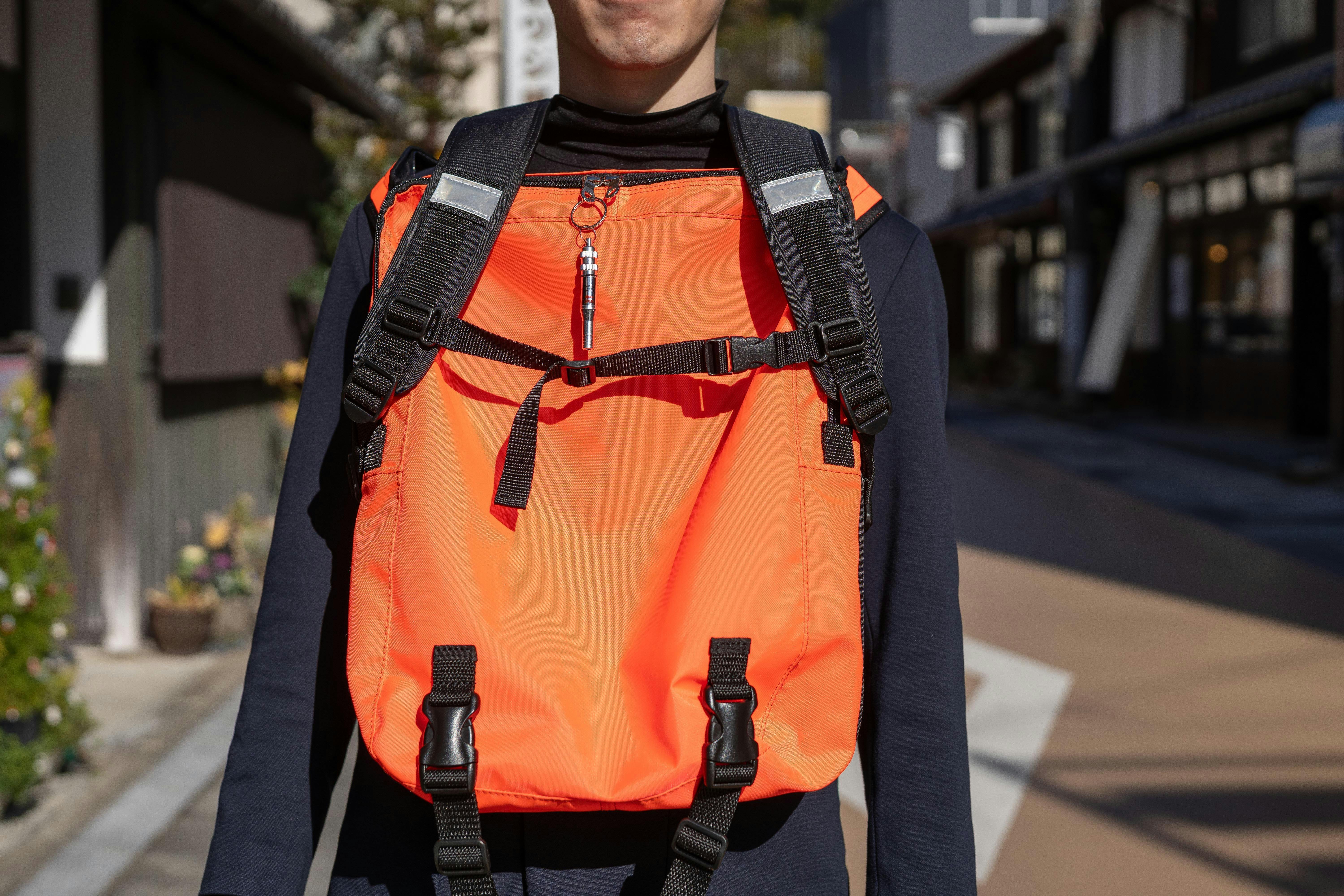 表側は日常の通学・通勤に馴染むデザインと容量を備え、教科書やノートPC、書類、部活動や仕事道具もしっかり収納できます。一方、裏地や一部パーツには視認性の高い蛍光色や反射材を用いて、薄暗い状況でも周囲から発見されやすいよう工夫しました。