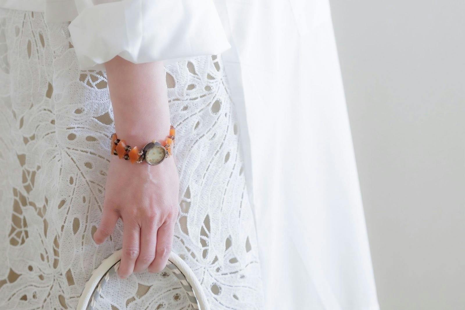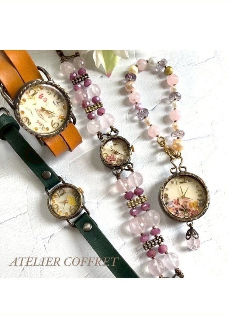 そんな思いで、天然石やガラスのビーズをあしらった時計を作ると