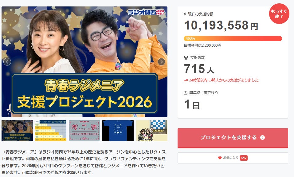 新春特番から始まった1ヶ月にわたるラジメニアクラウドファンディング2026もいよいよ明日で受付終了となります。