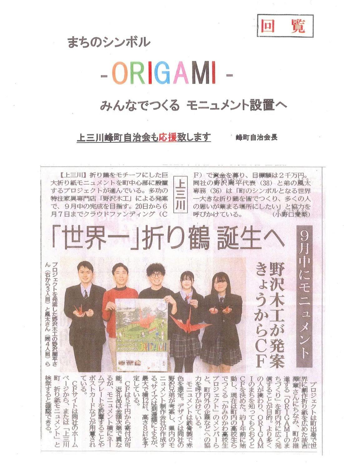 ORIGAMIモニュメントクラウドファンディング協賛チラシに名前を掲載する権利(中) 掲載したチラシは下野新聞の上三川地域に折り込みます。 チラシには支援者様のお名前(ニックネーム)または企業名を掲載します。 ・掲載方法:文字のみ、ロゴ/バナーの掲載は不可 ・掲載サイズ:中(9×3.5cm程度)※寸法は多少前後する可能性がございます。 ・支援時、必ず備考欄に希望されるお名前をご記入ください。 ※2026年9月秋頃の新聞に1回 ※お名前が掲載されたチラシはお送りさせて頂きます。