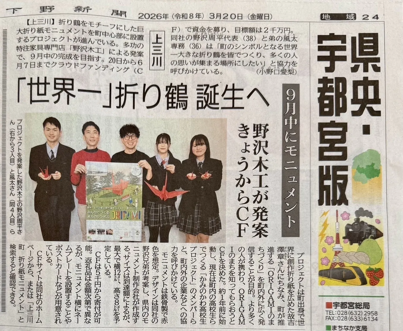 折り紙モニュメントプロジェクトのご成功と、上三川町のさらなるにぎわいを心より応援しています。