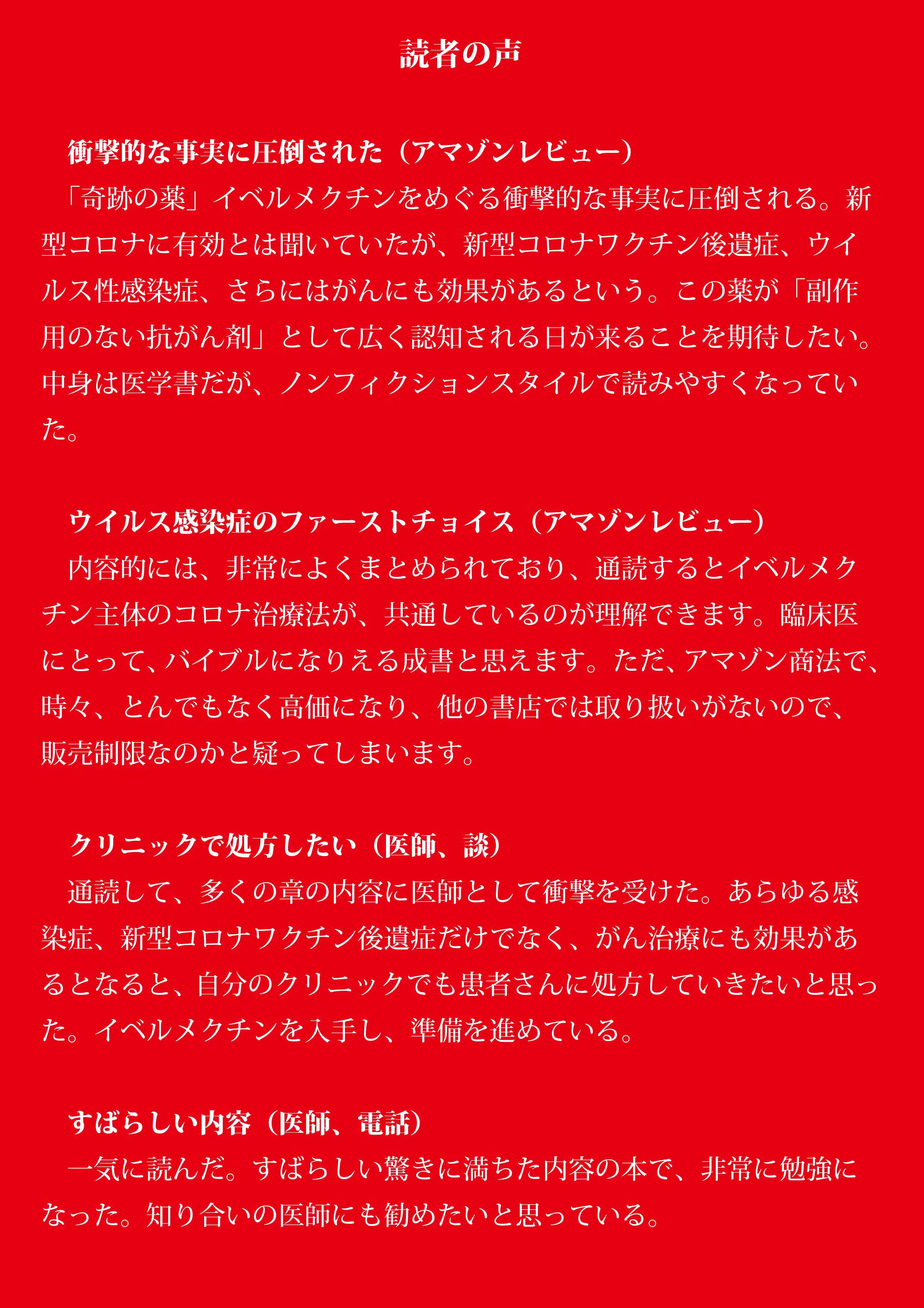 イベルメクチンの効用について開発者の大村智博士は「私たちはイベルメクチンの効能の10分の1も理解していない」と話しています。この薬は20世紀のペニシリン発見と肩を並べるような多くの病気から人類を救うミラクル・ドラッグになる可能性が十分にあります。現時点で判明しつつあるイベルメクチンに関する最新の情報が本書にはあります。現在進行形でがんなどの病と闘っている人の命を救う可能性がある本として一人でも多くの人に届けたいと思っております。よろしくご協力ください。