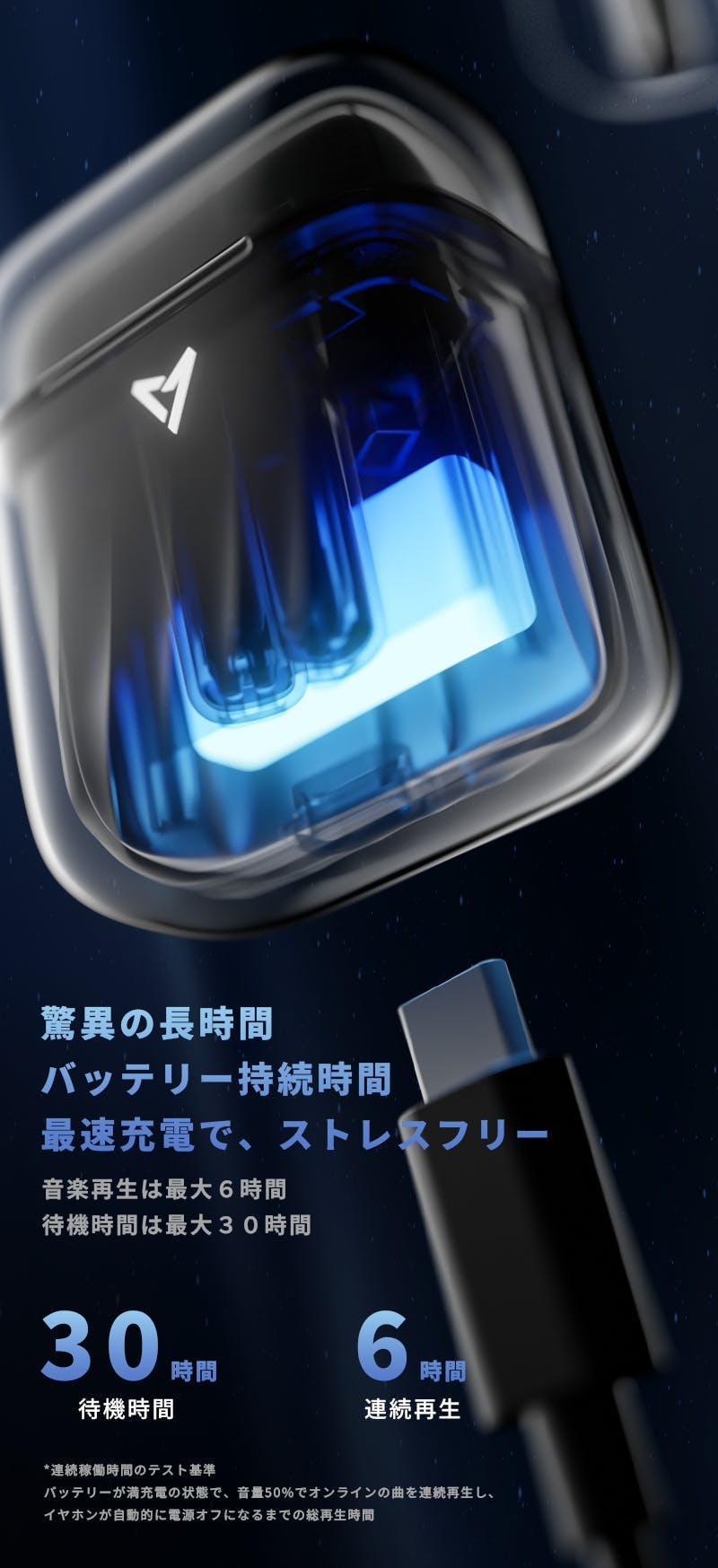 1回の充電で最大6時間の連続再生- 充電ケースを含めると総再生時間は約30時間