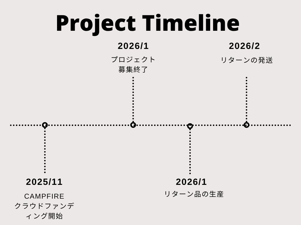◯ 商品引渡しまたは役務提供の時期:各プロジェクトが募集期間内に成立した場合のみ、支援金の決済が行われ、約定されたリターンを得る権利が発生します。なお、リターン毎の発送(履行)時期は各プロジェクトの記載・連絡に準じます。諸般の事情により遅延・遅配が生じる場合は、プロジェクトオーナーより記載・連絡されるものとします。