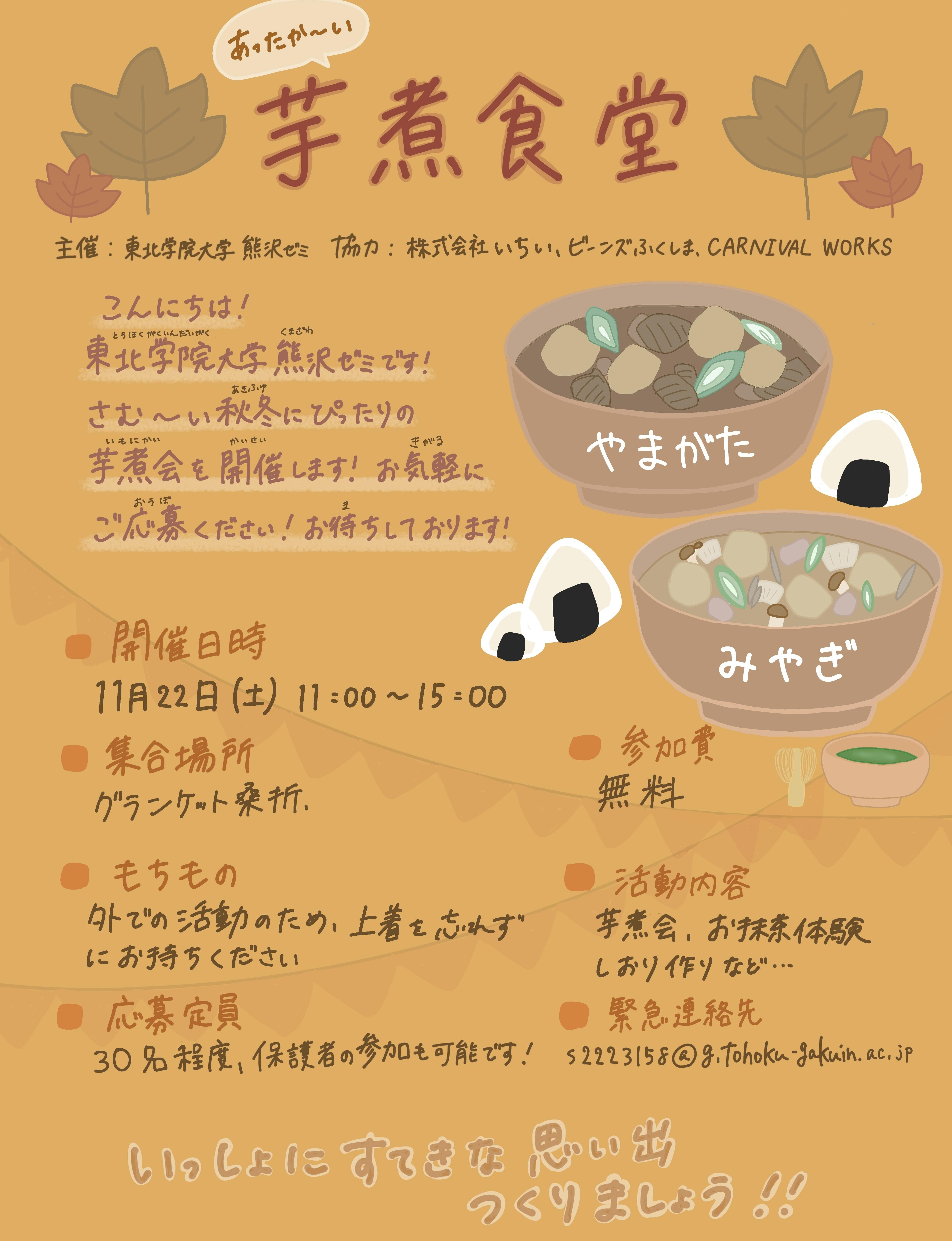 11月22日土曜日の11時から15時の時間で芋煮会、お抹茶体験、しおり作り、そして外で遊ぶなどのレクレーションをしたいと考えています。詳しくは下記の「どんなことをするのか」の欄に書かせていただいたので、ぜひご覧ください!