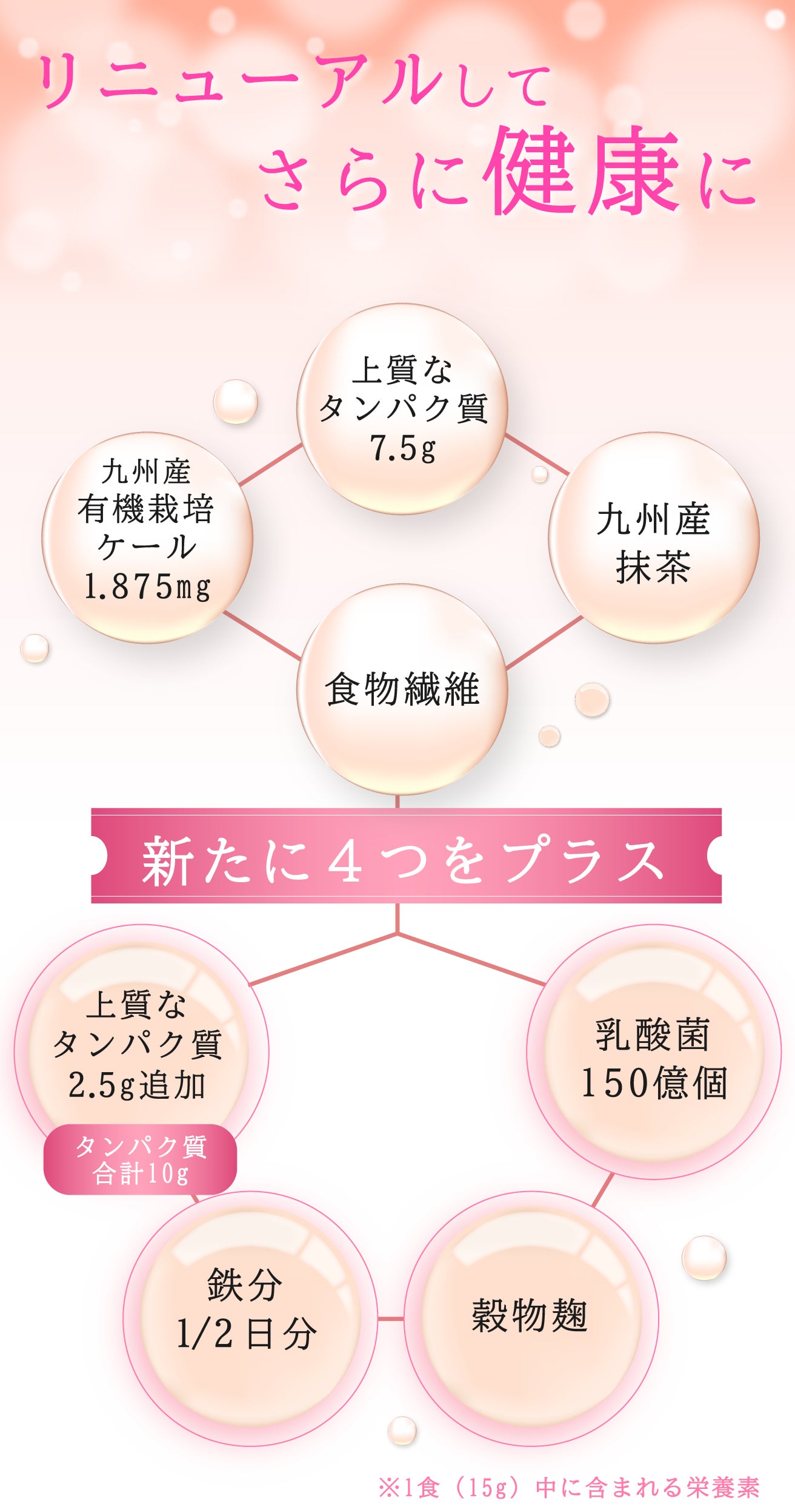 1杯(15g)に、必須アミノを理想的なバランスで含むアミノ酸スコア100の「上質なタンパク質」を10gも配合。