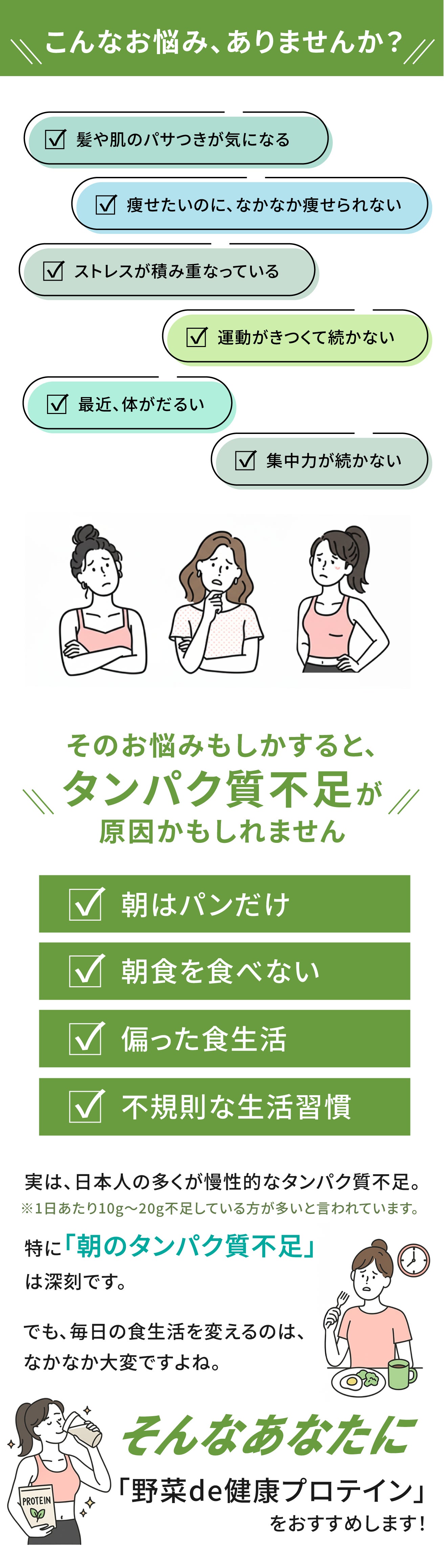その原因のひとつが、タンパク質不足です。
