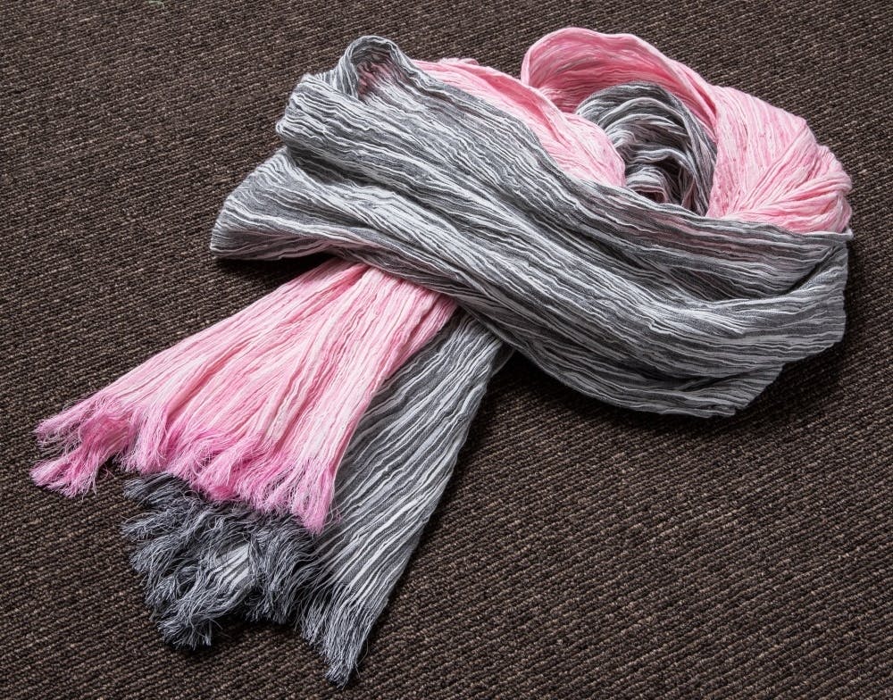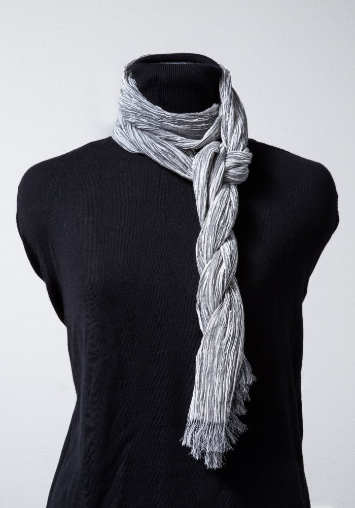 コットンの襟巻きは通常ハリがなく首に巻いたとき、しなっとなって貧相になりがち。でもこころばせ楊柳ストールは襟巻きとしてもしっかり存在感があります。