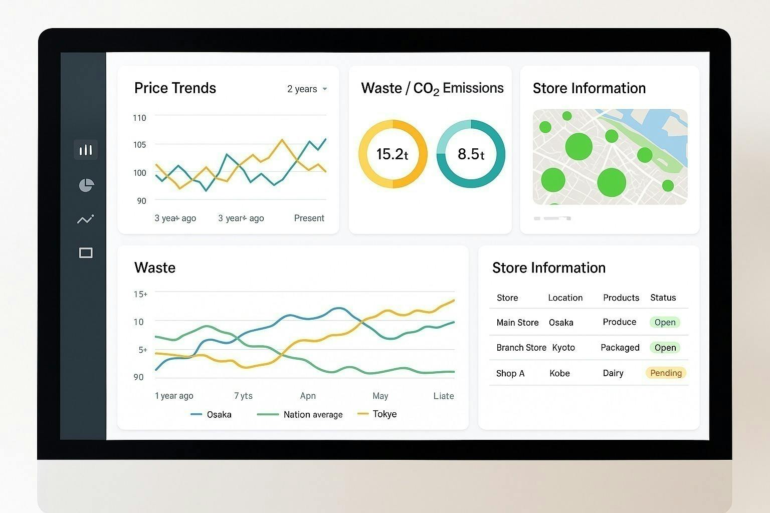 自治体や企業は、物価・ロス・CO₂排出量などの統計を可視化し、地域政策や環境対策に活かすことができます。