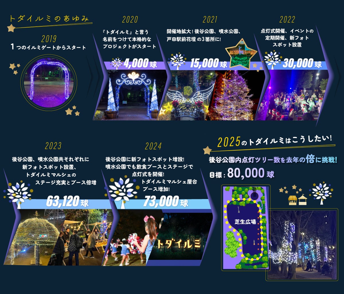 あのとき灯した小さな光は、地域の皆さまの温かいご支援とご協力により、 いまでは戸田市の冬を彩る風物詩と思ってもらえるように少しずつ育ってきました。