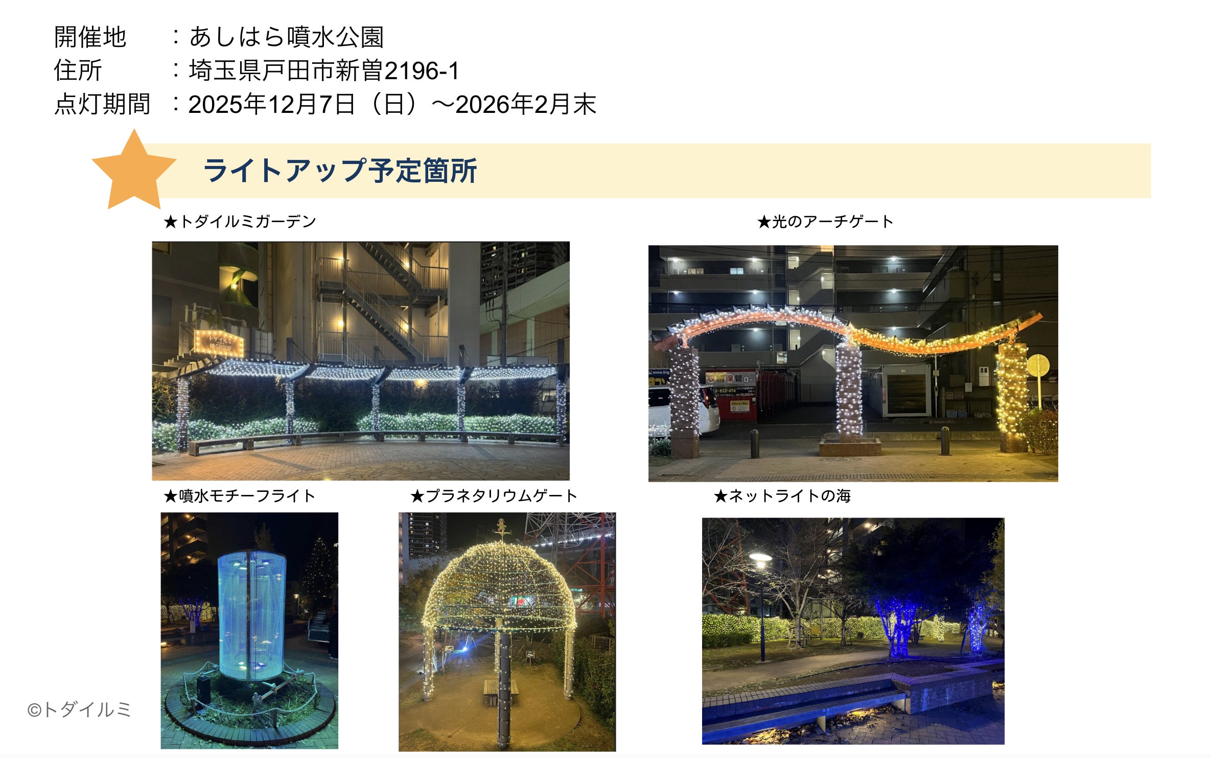 点灯期間中には、ぜひ会場でお気に入りの光を見つけて、写真とともに #トダイルミ をつけてSNSに投稿してください。