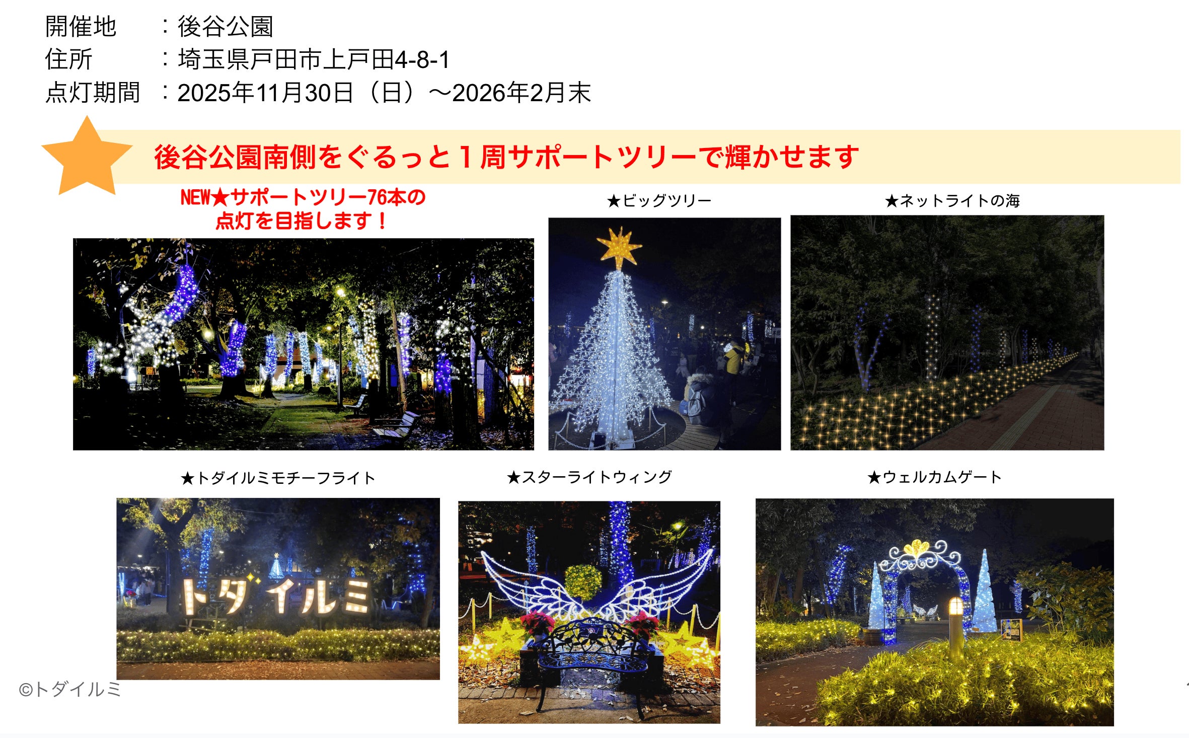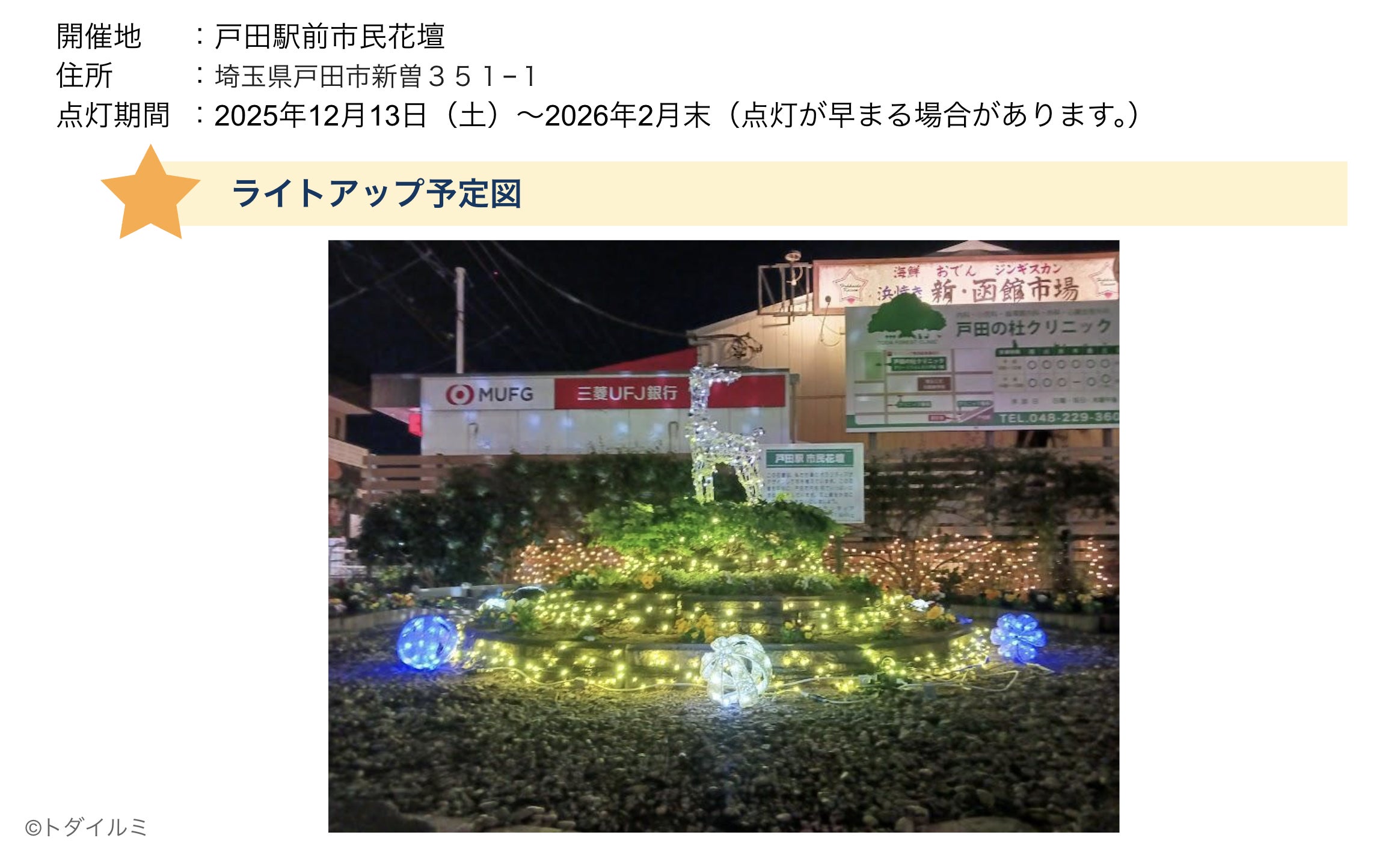 今年も皆さんのご支援が、戸田市の冬を彩るイルミネーションの光となり、街と人々の心を明るく照らしてくれることを願っています。