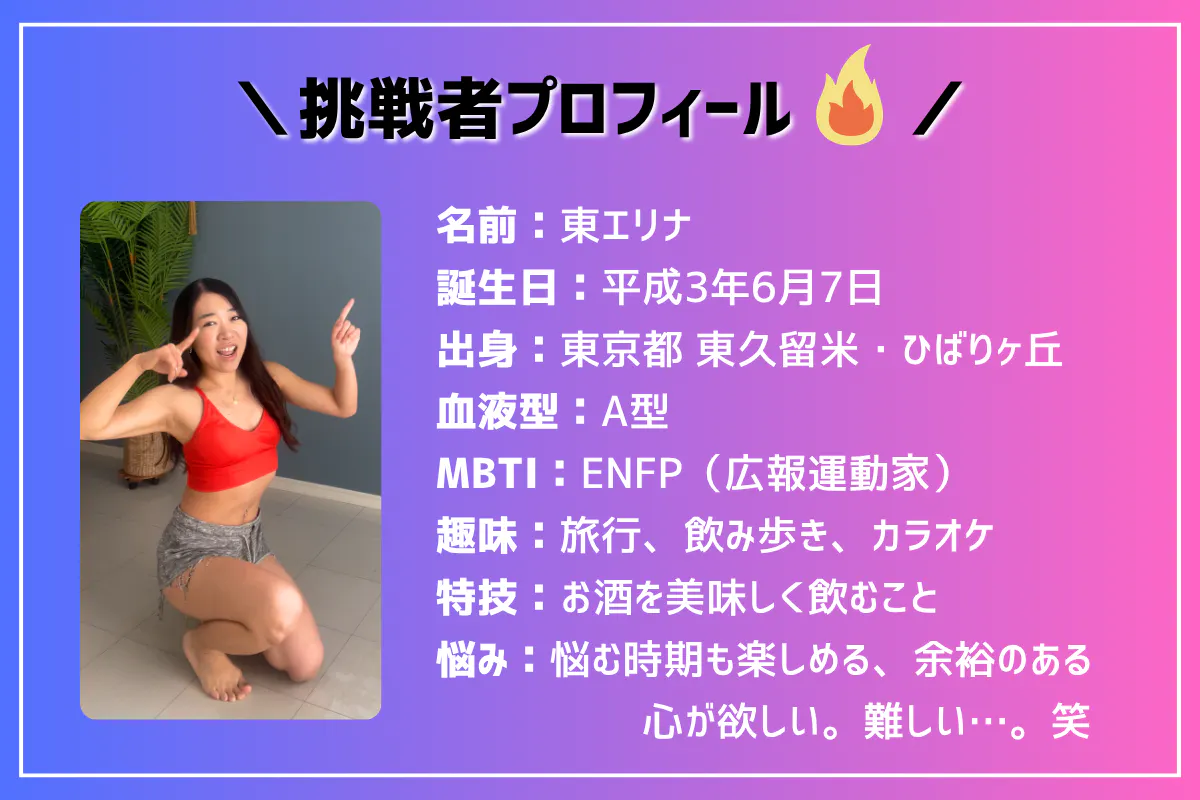 こんにちは!ダンスダイエットフェス実行委員長の東エリナ(ひがしえりな)です。