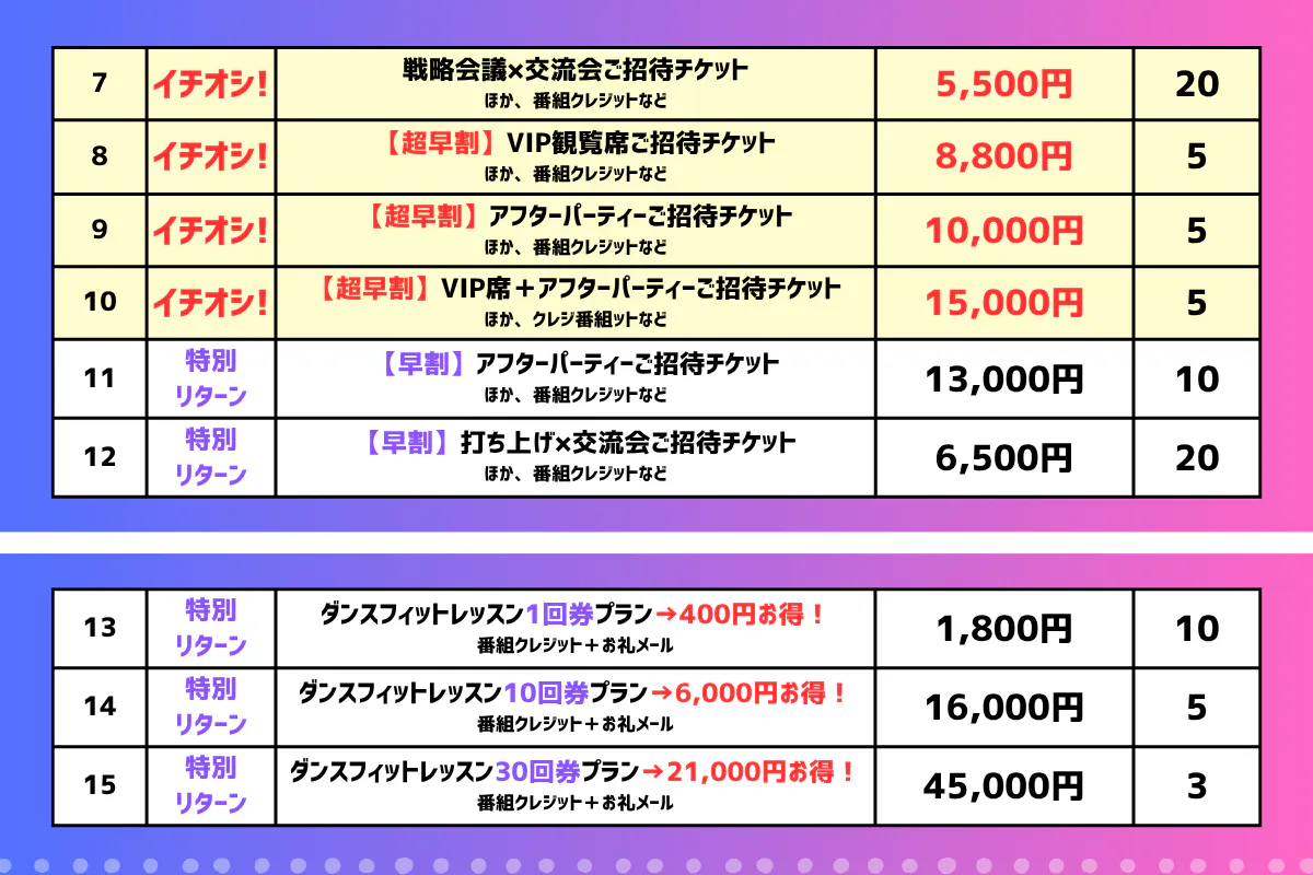 全プランに、番組クレジット(あなたの名前が番組のエンドロールに)が付いており、一緒にイベントをつくる貴重な体験をお楽しみいただけます!