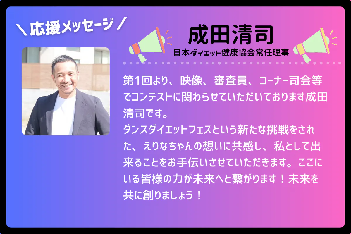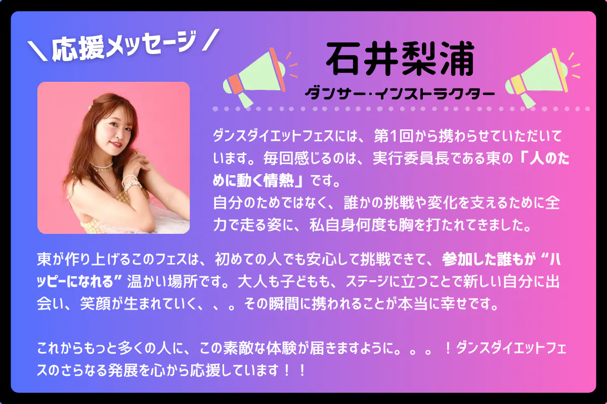 私自身、ダイエットやダンスに苦手意識を持っていた経験があります。だからこそ、無理をせず、楽しみながら健康をつくる場を広げたい。心も体も、地球まるごと笑顔にするために・・・「楽しむ健康」を文化にすることが、私のライフワークです。