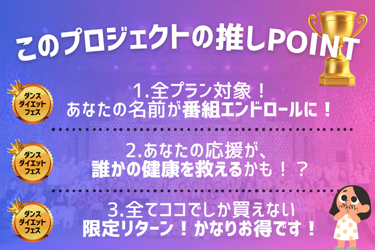 イベントの目玉「ダンスダイエットコンテスト」のテーマでもある、“応援が支える”という文化。それを形にできるのは、やはりクラウドファンディングしかないと思いました。