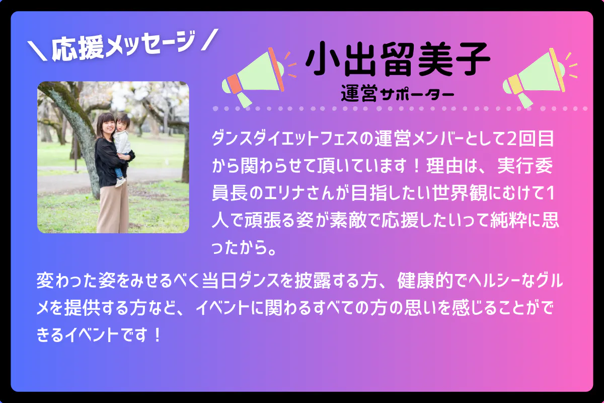 これまでの開催で、たくさんの喜びの声をいただきました。「ダンスのおかげで楽しく痩せられた!」「挑戦を応援することで元気をもらった!」そんな声をもっと広げていきたい。