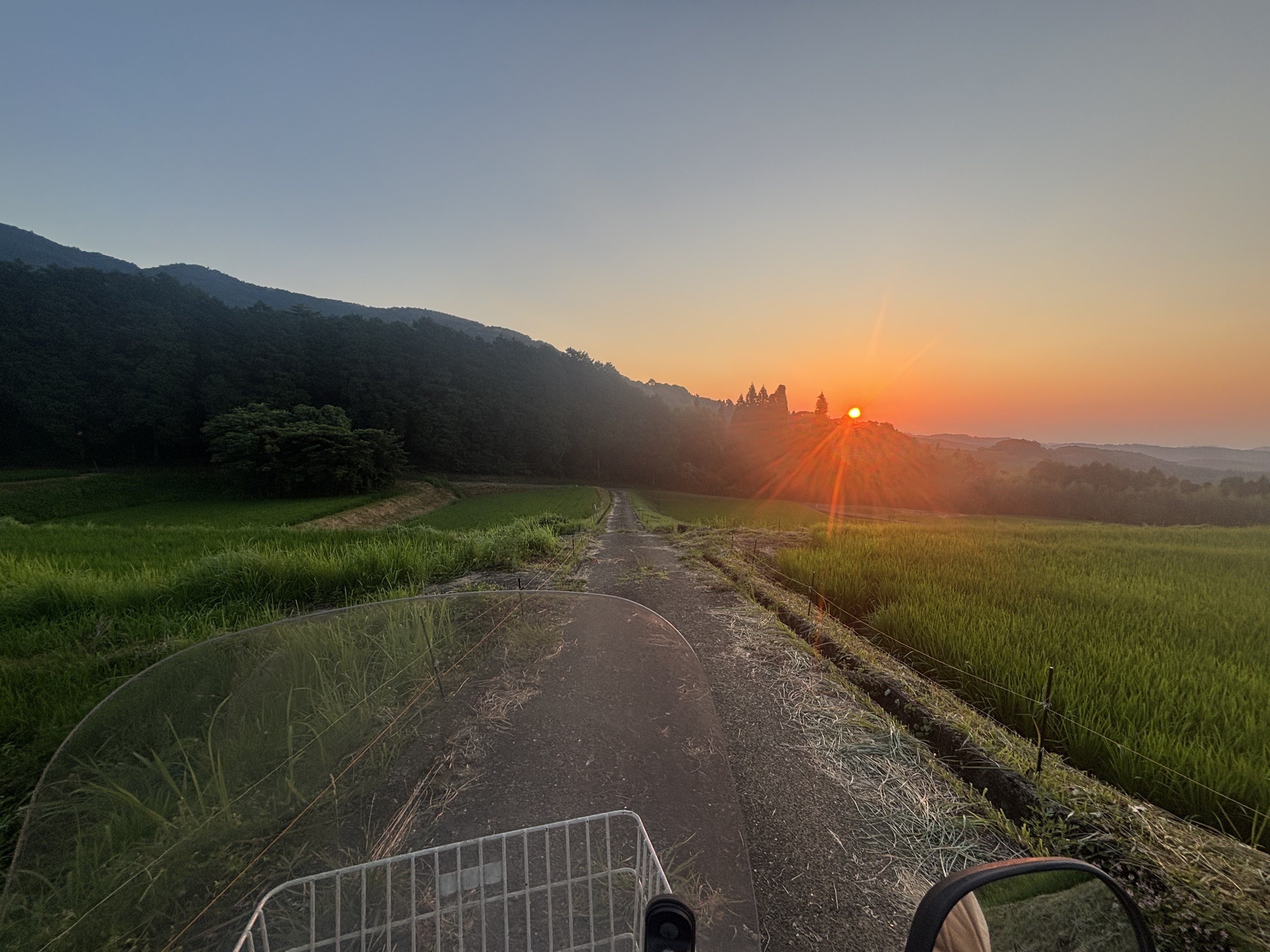 写真は午前5:00ごろの朝日です。早朝と夕方に原付バイクを運転し、田んぼの水を見に行くのですが、思わずはっとする美しさがあります。